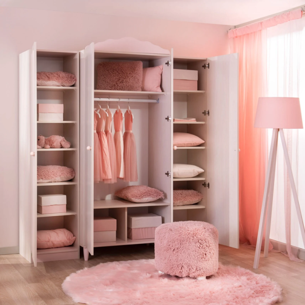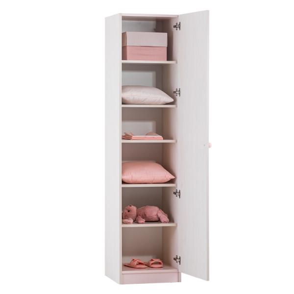 Еднокрилният гардероб POLLINA е стилно и удобно решение за допълнително съхранение в детската стая. С компактните си размери и модулен дизайн, той се вписва лесно в различни конфигурации и може да се комбинира с други мебели от серията. Посоката на отваряне на вратата може да се избере според предпочитанията и разположението в стаята. Моделът разполага с 5 регулируеми рафта, всеки с товароносимост до 25 кг, а вратата се затваря плавно и безшумно благодарение на специалните панти със спирачка. ABS дръжката е здрава и удобна, а корпусът е изработен от висококачествени материали, подходящи за детски интериор.