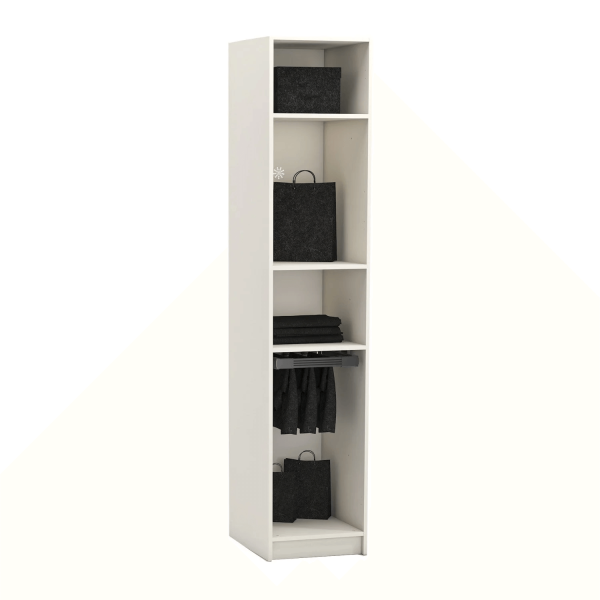 Еднокрилният гардероб YORK съчетава стил и функционалност. Изработен от висококачествено ПДЧ с дебелина 18 мм в елегантен кремав цвят, той разполага с четири рафта за практично съхранение и изтеглящ механизъм за панталони за по-лесен достъп и организация. Гардеробът се предлага без врата , която може да бъде закупена допълнително като опция. Може да се използва самостоятелно или в комбинация с модулите от серията YORK в същия цвят.