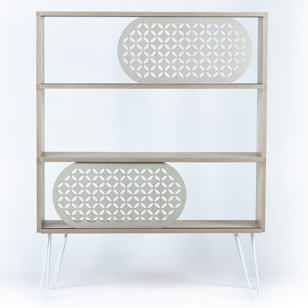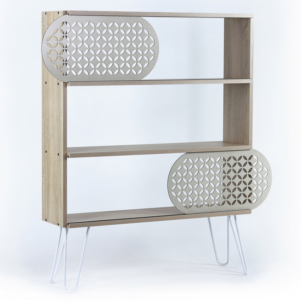 Подов рафт с плъзгащи се врати в нюанс сонама с детайли в мръсно бяло и бяло. Изработен от висококачествен меламин с метални крака. Има 3 повърхности за съхранение на книги и други предмети с две плъзгащи се врати. Модерният дизайн и специалните шарки на плъзгащите се врати създават оригинална атмосфера в пространството. Комбинирайте го с останалите мебели от серия Diane, за да постигнете уникална композиция. Цвят: Сонама, Бяло, Екрю Размери: 94x25x117Y см. Европейско производство и произход. Продуктът се предлага разглобен във фабрична опаковка.