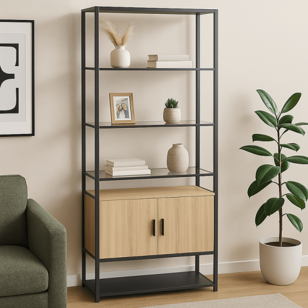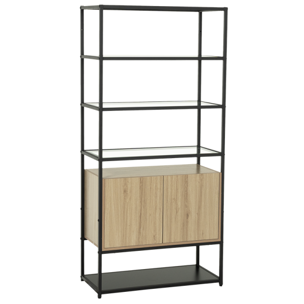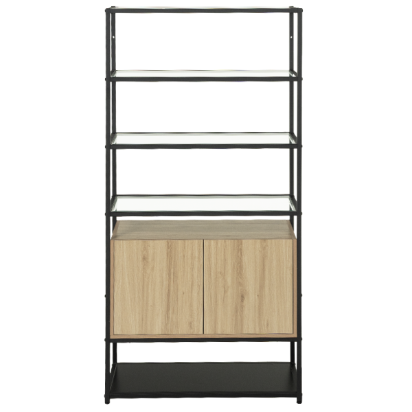 Етажерка HALMSTAD впечатлява със съвременно излъчване и балансиран дизайн. Металната конструкция с черен праховобоядисан финиш придава стабилност и индустриален характер, а рафтовете от закалено стъкло внасят усещане за лекота. Вграден шкаф от 15 мм МДФ с меламиново покритие в топъл дървесен цвят допълва визията с практичност и елегантност.