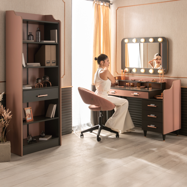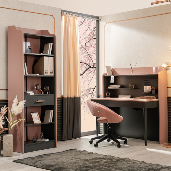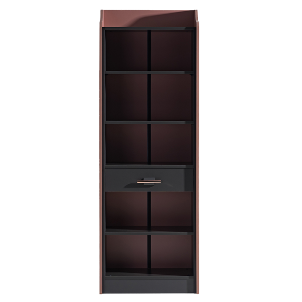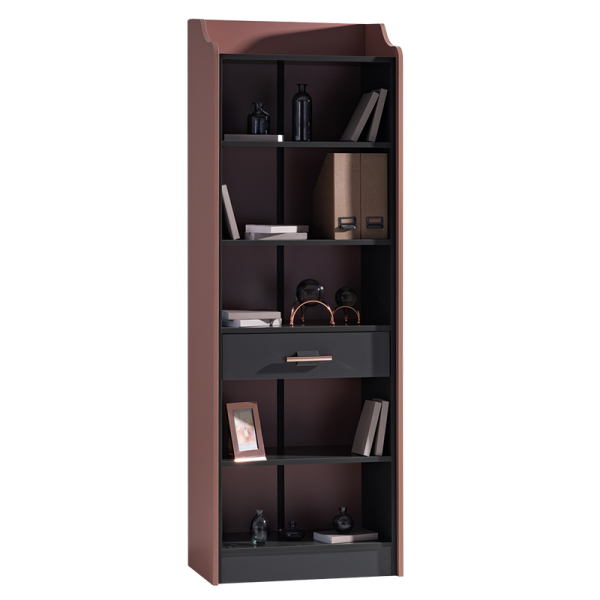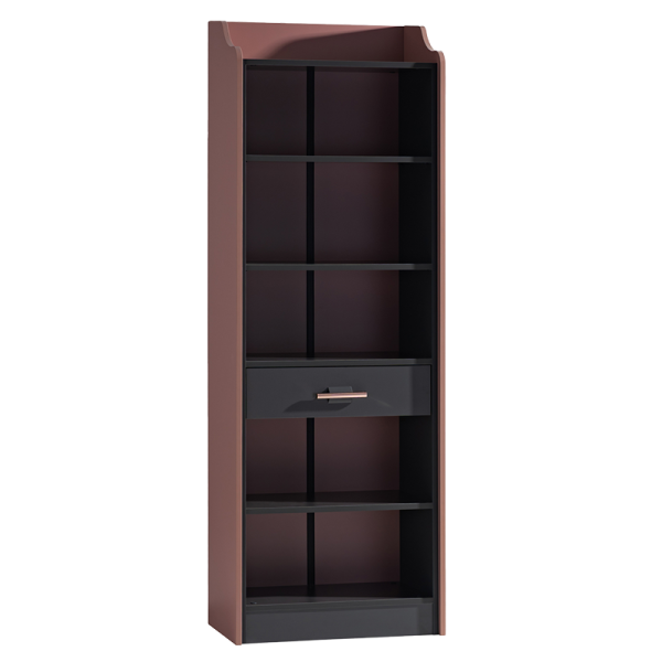 Етажерка за книги VALENCIA е проектирана, за да внесе ред и стил в стаята. Със своите 6 рафта и централно чекмедже с елегантна дръжка, тя предлага достатъчно пространство за съхранение както на книги и списания, така и на декоративни предмети. Всеки рафт издържа до 25 кг и може лесно да се премахва или пренарежда според нуждите. Чекмеджето е оборудвано с механизъм с плавно затваряне, осигуряващ тиха и безопасна употреба. Изработена от висококачествен 18 mm материал, етажерката е устойчива и стабилна, като съчетава модерен и изискан дизайн за елегантен завършек на интериора.
