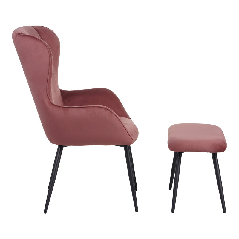 Това елегантно кресло, със своята комбинация от кадифе и черна метална рамка, добавя нотка лукс към всяко пространство. Приложената табуретка идеално допълва комплекта и може да се използва като поставка за крака или като допълнителна седалка.