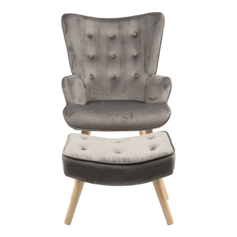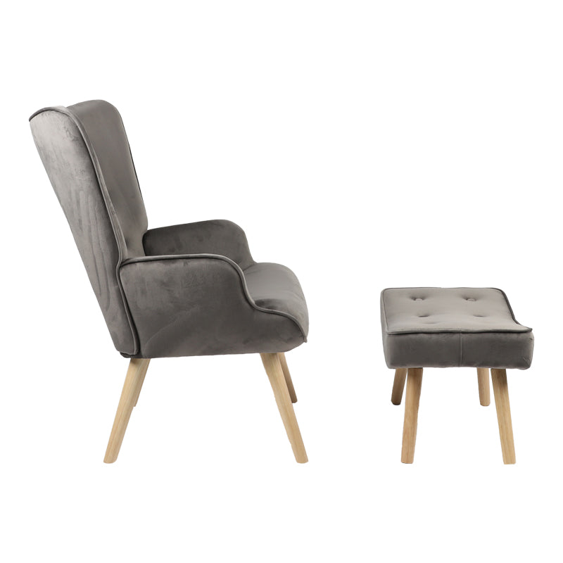 Това е фотьойл заедно с табуретка, който е върхът на иновативния интериорен дизайн, хармонично съчетаващ съвременните издръжливи материали с лукс и ергономичност. Произведение на изкуството с несравнима естетика, което ще издигне декорацията на вашето пространство. Подходящ за всеки модерен дом и бизнес пространство.