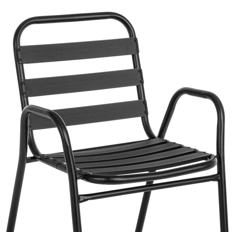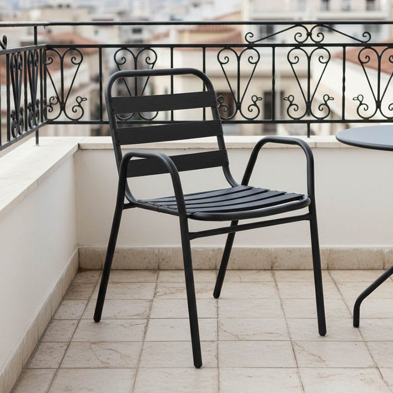 - Здрава рамка от висококачествен метал, устойчив на износване и време, а седалката и облегалката са изработени от алуминиеви ламели. Металът осигурява издръжливост и стабилност, а алуминиевите ламели придават лекота и модерна нотка на дизайна. Този стол е идеален за използване на открито, тъй като устойчивите на атмосферни влияния свойства на алуминия го правят устойчив на излагане на слънце и влага.
