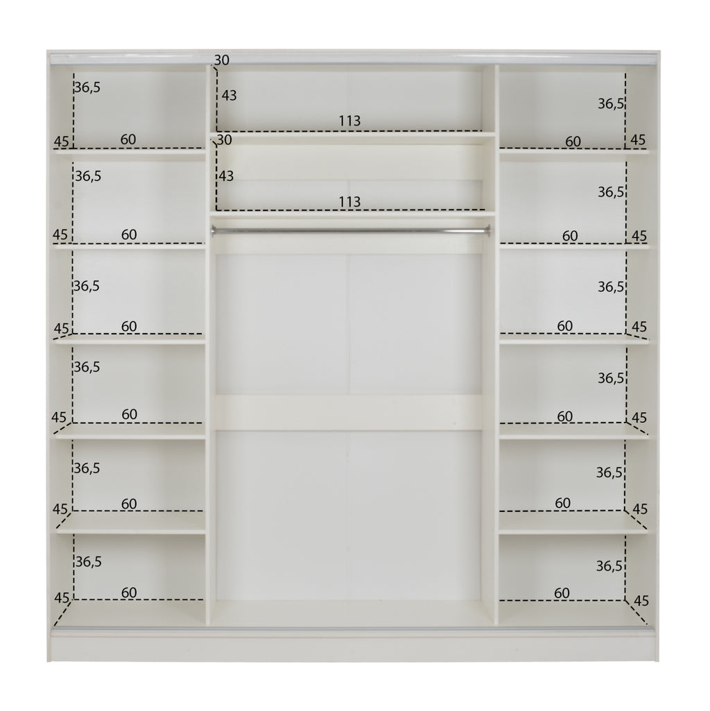 Този гардероб е идеалното решение за всеки, който търси функционална и стилна мебел за спалня. Плъзгащите се врати с вградено огледало спестяват място и добавят елегантност, докато вътрешната организация с 14 рафта и релса за дрехи осигурява перфектен ред. Просторната дълбочина от 60 см позволява удобно съхранение на всички ваши дрехи, обувки и аксесоари.