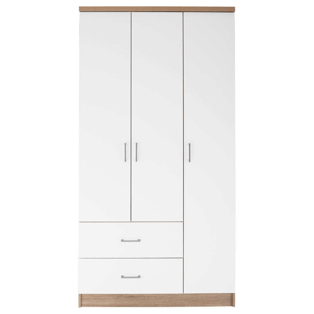 Трислоен меламинов гардероб в сонама и бял нюанс. Вътре в гардероба има метална греда, специално изработена за окачване на дрехи, а в долната част има 2 големи чекмеджета за съхранение на дрехи. Има 4 зони за съхранение на един лист. Размери: 89х42,5х181см. Размери на рафтове А: 28х40,5х41 см. B размери на рафта: 28x40.5x41.5 см. C размери на рафта: 28x40.5x39.5 см. Размери на рафта D: 28x40,5x41,5 см. Размери на гардероба: 57х40х125.5см. Височина на закачалката: 114 см. Размери на чекмедже А: 52,5х32,5х18 см. Размери на чекмедже B: 52.5x32.5x19 см. Забележки Гардеробът се предлага в разглобена опаковка с подробни инструкции за сглобяване.