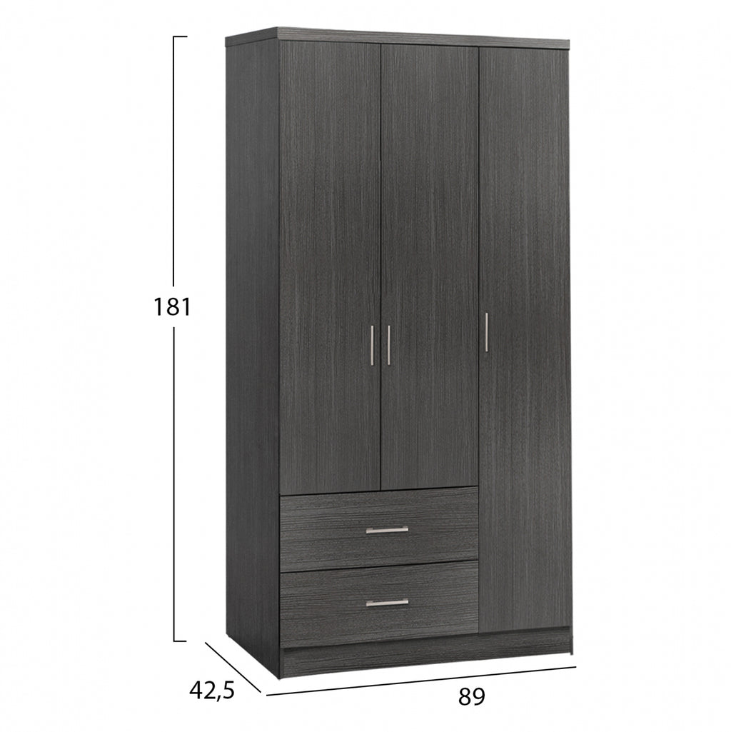 Трикрил меламинов гардероб в цвят Зебрано. Вътре в гардероба има метална греда, специално изработена за окачване на дрехи, а в долната част има 2 големи чекмеджета за съхранение на дрехи. Има 4 зони за съхранение на един лист. Размери: 89х42,5х181см. Размери на рафтове А: 28х40х41см. B размери на рафта: 28x40x41.5 см. C размери на рафта: 28x40x39.5 см. Размери на рафта D: 28x40x41,5 см. Размери на гардероба: 57х40х125.5см. Височина на закачалката: 114 см. Размери на чекмедже А: 52x32x18 см. Размери на чекмедже B: 52x32x19 см. Забележки Гардеробът се предлага в разглобена опаковка с подробни инструкции за сглобяване.