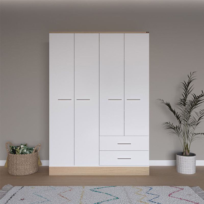 - Характеристики: Четири врати, прикриващи просторни вътрешни рафтове за дрехи, спално бельо или други предмети; две просторни чекмеджета в долната част за дребни вещи и аксесоари; здрава основа в естествен дървесен тон, осигуряваща стабилност и подобряваща естетиката на продукта; ергономични и елегантни дръжки за лесно отваряне и затваряне.