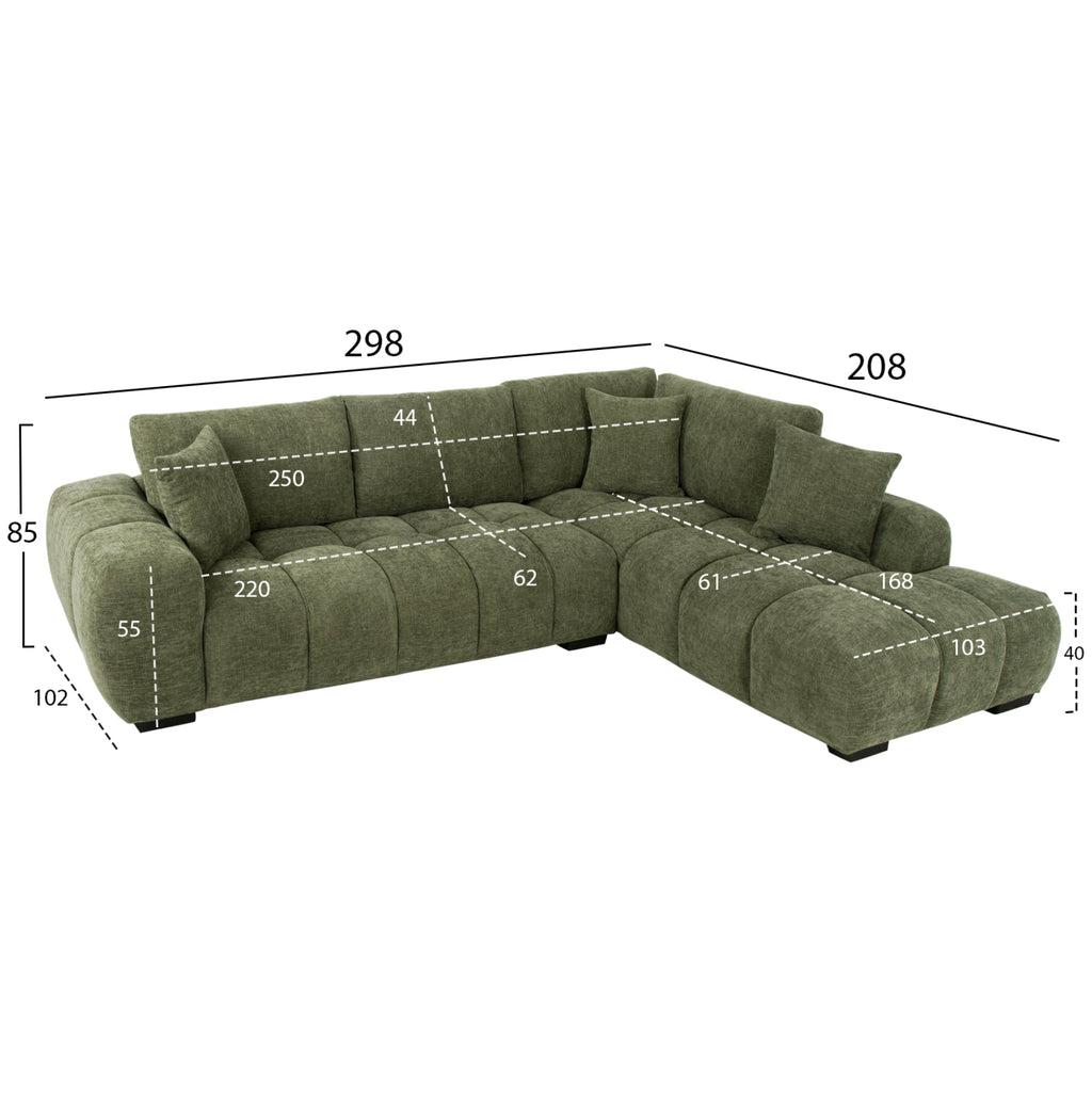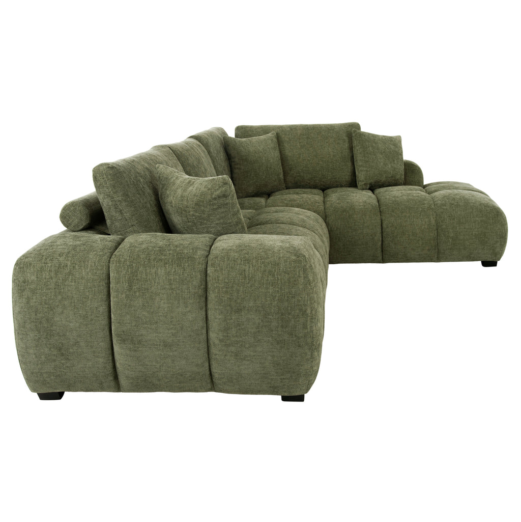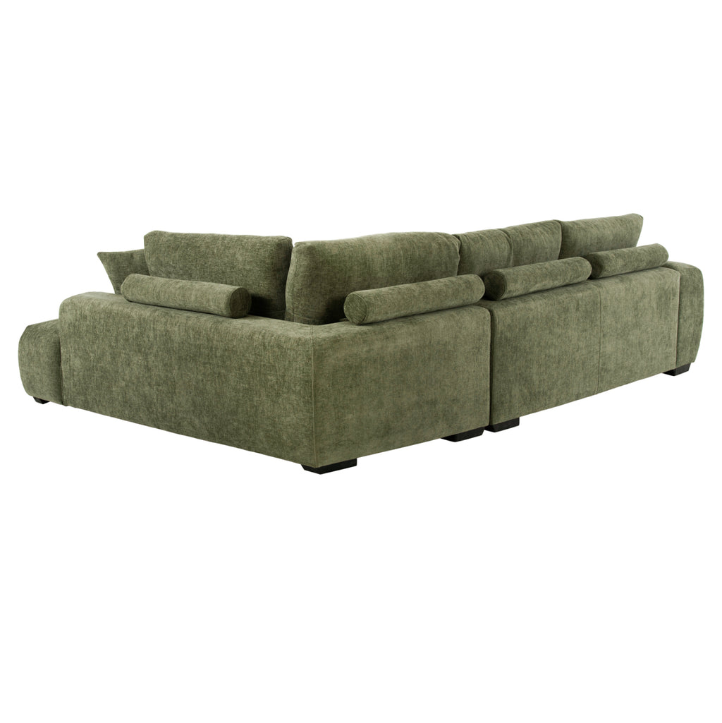 Представяме ви COVEN, прекрасен голям диван в ДЕСЕН ъгъл (както го гледате), тапициран с качествен плат в ЗЕЛЕН цвят. Започвайки от дизайна, диванът е много нисък в стил "престилка" и има широки и къси крака-основи в черен цвят. Подлакътниците са впечатляващо широки, а тапицерията е в капитониран стил с дръзки шевове! Мебелта, която оформя ъгъла, има същата естетика и е свързана с основния диван чрез вертикални закачалки за панели. Облегалката е ниска и има 4 възглавници за гръб с дълги, тесни цилиндрични възглавници на гърба за по-добра опора, както и 3 по-малки декоративни възглавници. Седалката е с пълнеж от пяна със средна твърдост, комбиниран с джобни пружини, предлагащи несравним комфорт. И разбира се, предлагаме този диван с 3-годишна гаранция на рамката!