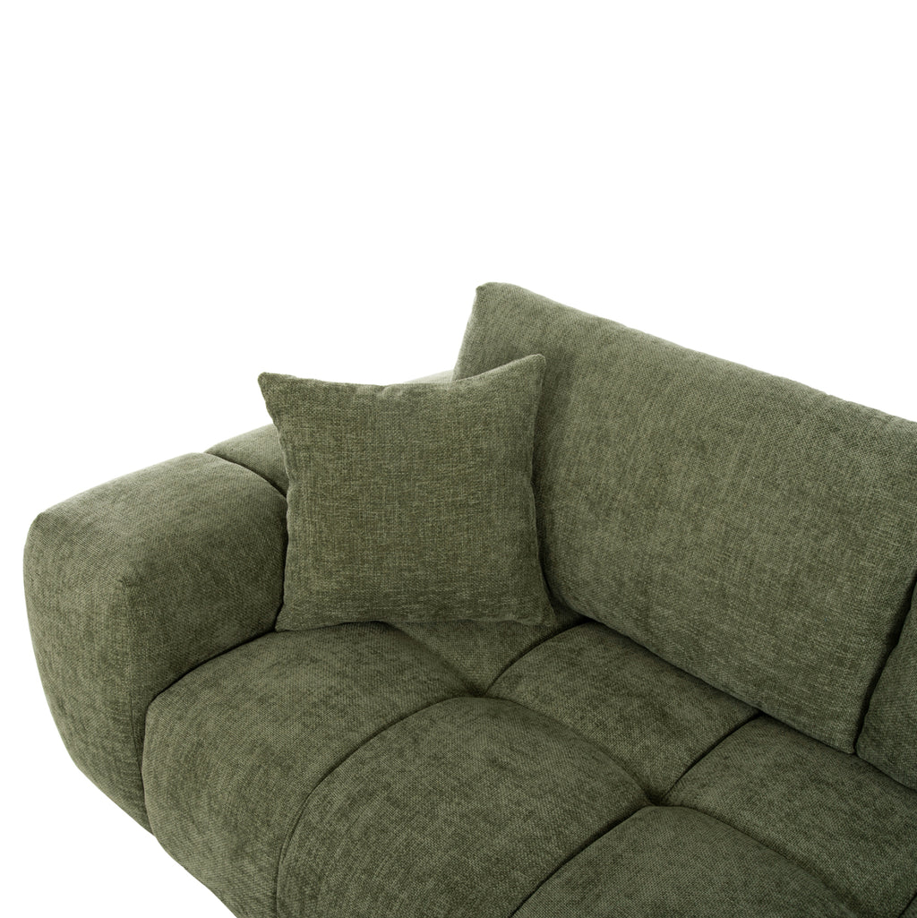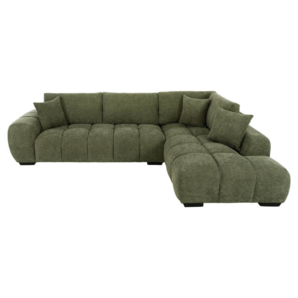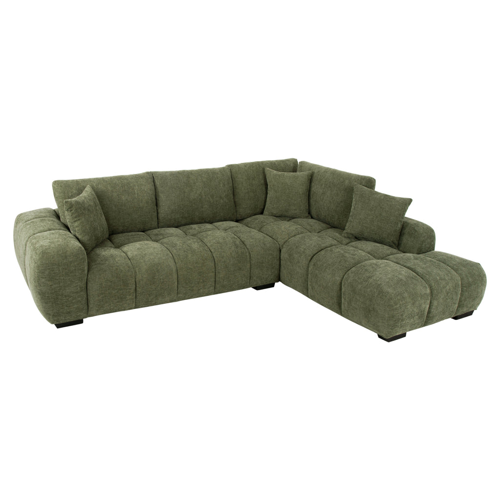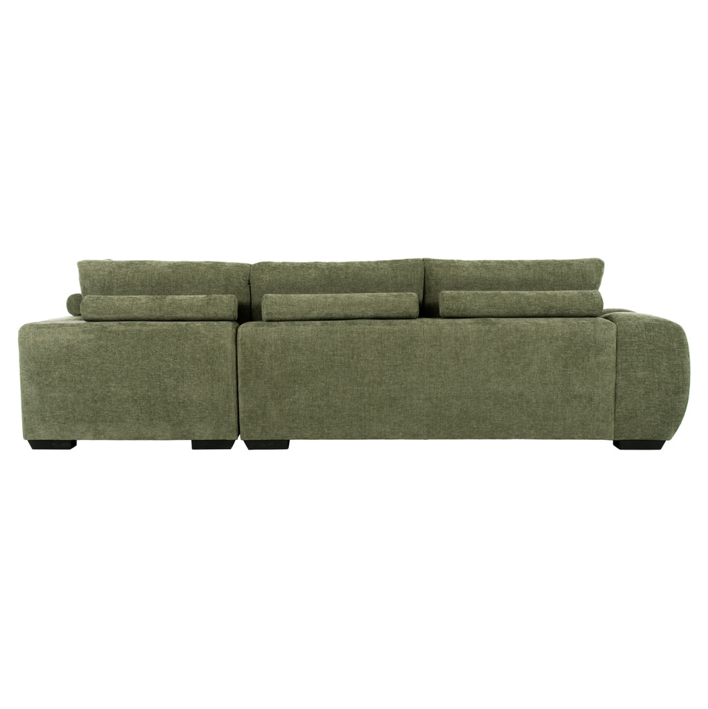 Представяме ви COVEN, прекрасен голям диван в ДЕСЕН ъгъл (както го гледате), тапициран с качествен плат в ЗЕЛЕН цвят. Започвайки от дизайна, диванът е много нисък в стил "престилка" и има широки и къси крака-основи в черен цвят. Подлакътниците са впечатляващо широки, а тапицерията е в капитониран стил с дръзки шевове! Мебелта, която оформя ъгъла, има същата естетика и е свързана с основния диван чрез вертикални закачалки за панели. Облегалката е ниска и има 4 възглавници за гръб с дълги, тесни цилиндрични възглавници на гърба за по-добра опора, както и 3 по-малки декоративни възглавници. Седалката е с пълнеж от пяна със средна твърдост, комбиниран с джобни пружини, предлагащи несравним комфорт. И разбира се, предлагаме този диван с 3-годишна гаранция на рамката!