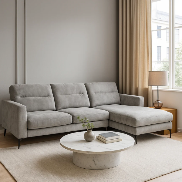Ъглов диван INGA е модерно и удобно решение за всекидневна зона, съчетаващо стил и функционалност. Конструкцията му е изработена от дърво и метал, което гарантира стабилност и дълготрайност. Седалката предлага изключителен комфорт благодарение на пълнежа от полиуретан и покет пружини, които осигуряват еластичност и равномерна опора. Тапицерията от висококачествена дамаска придава мекота и елегантен вид, а металните крака допълват съвременния му характер. INGA е идеален избор за интериори, в които комфортът и стилът вървят ръка за ръка.