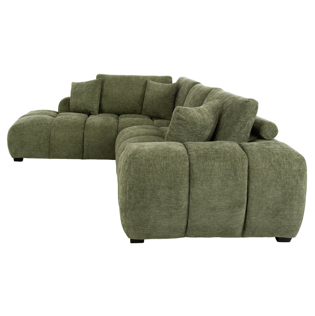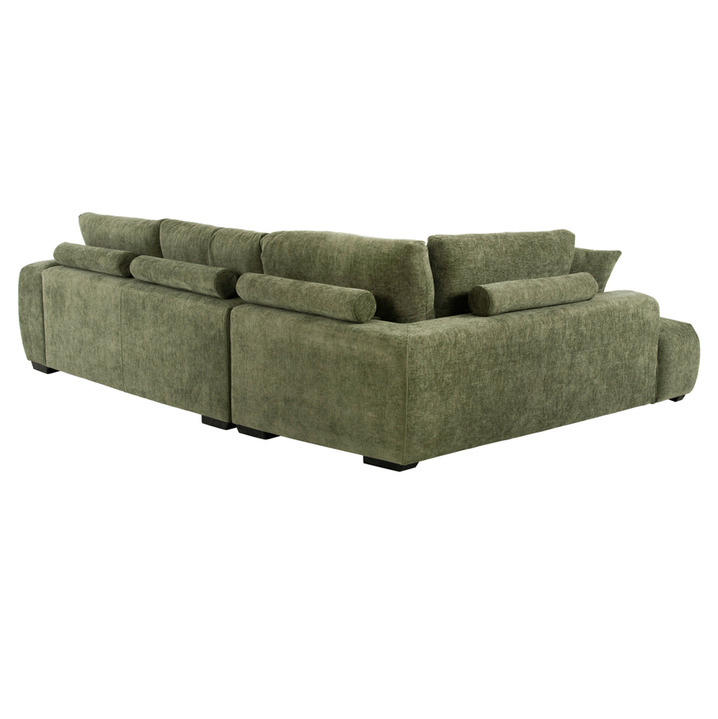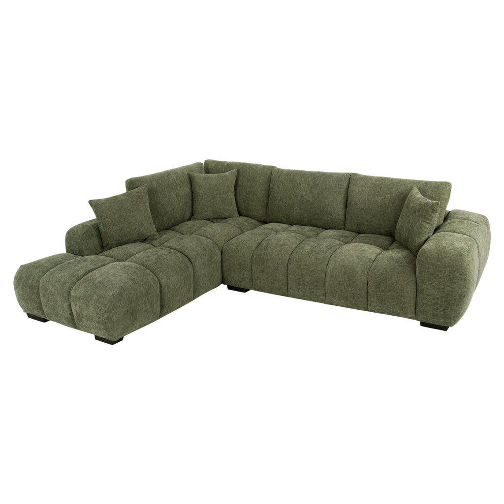 Представяме ви COVEN, прекрасен голям диван в ЛЯВА ъглова конфигурация (както го погледнете), тапициран с качествен плат в ЗЕЛЕН цвят. Започвайки от дизайна, диванът е много нисък в стил "престилка" и има широки и къси крака-основи в черен цвят. Подлакътниците са впечатляващо широки, а тапицерията е в капитониран стил с дръзки шевове! Мебелта, която оформя ъгъла, има същата естетика и е свързана с основния диван чрез вертикални закачалки за панели. Облегалката е ниска и има 4 възглавници за гръб с дълги тесни цилиндрични възглавници на гърба за по-добра опора, както и 3 по-малки декоративни възглавници. Седалката е с пълнеж от пяна със средна твърдост, комбиниран с джобни пружини, предлагащи несравним комфорт. И разбира се, предлагаме този диван с 3-годишна гаранция на рамката!