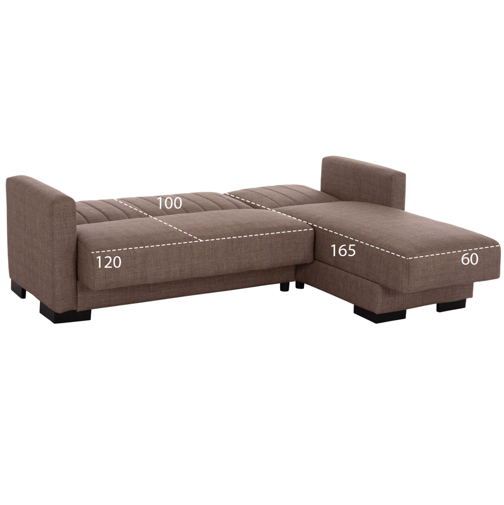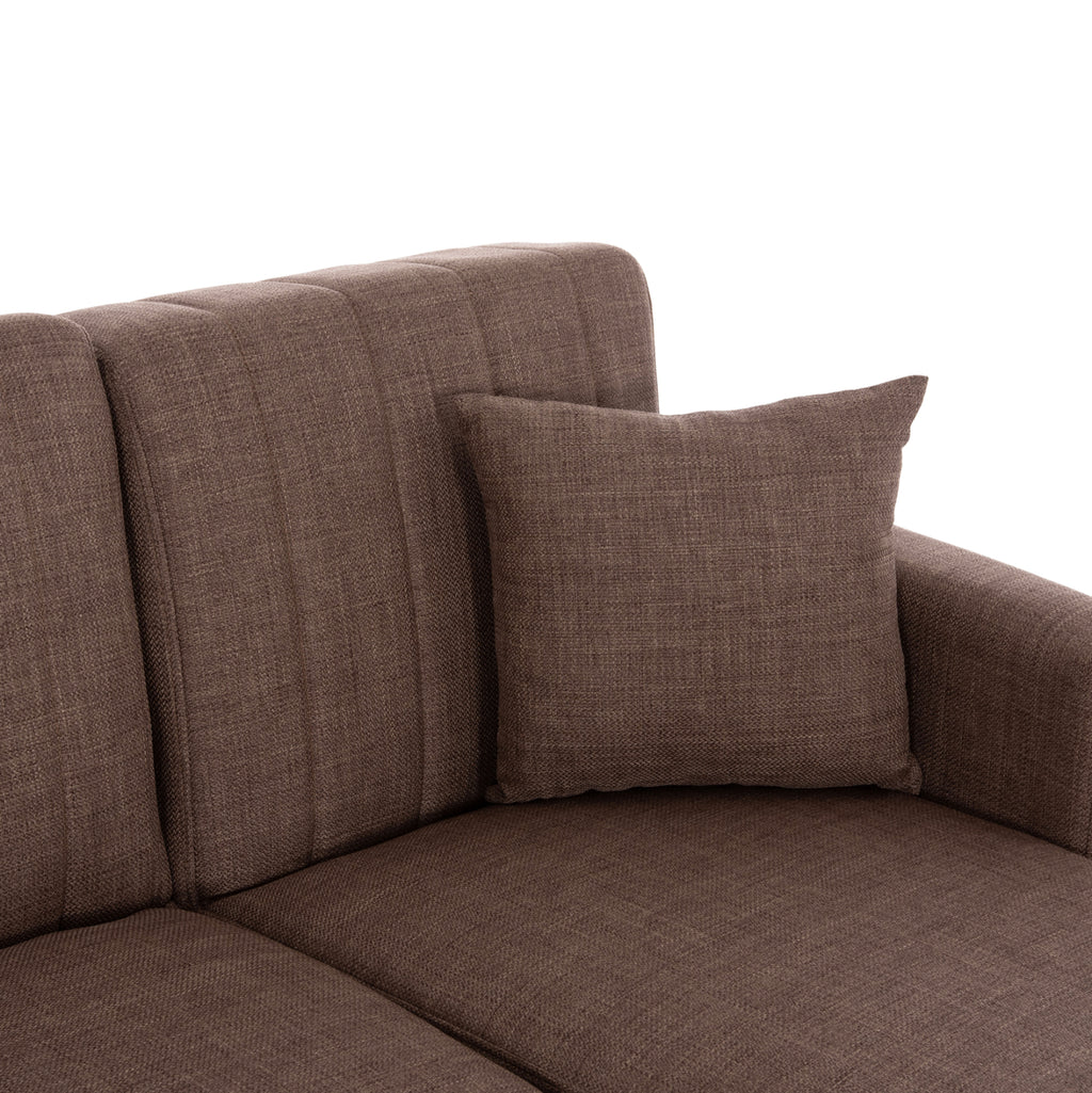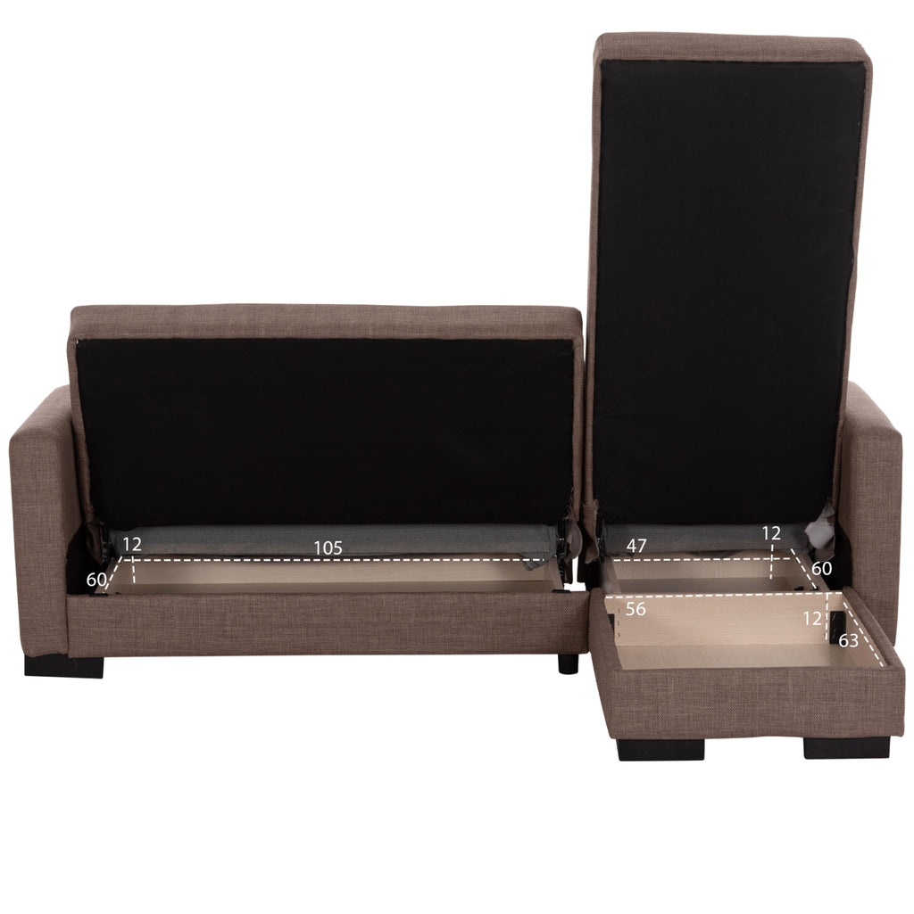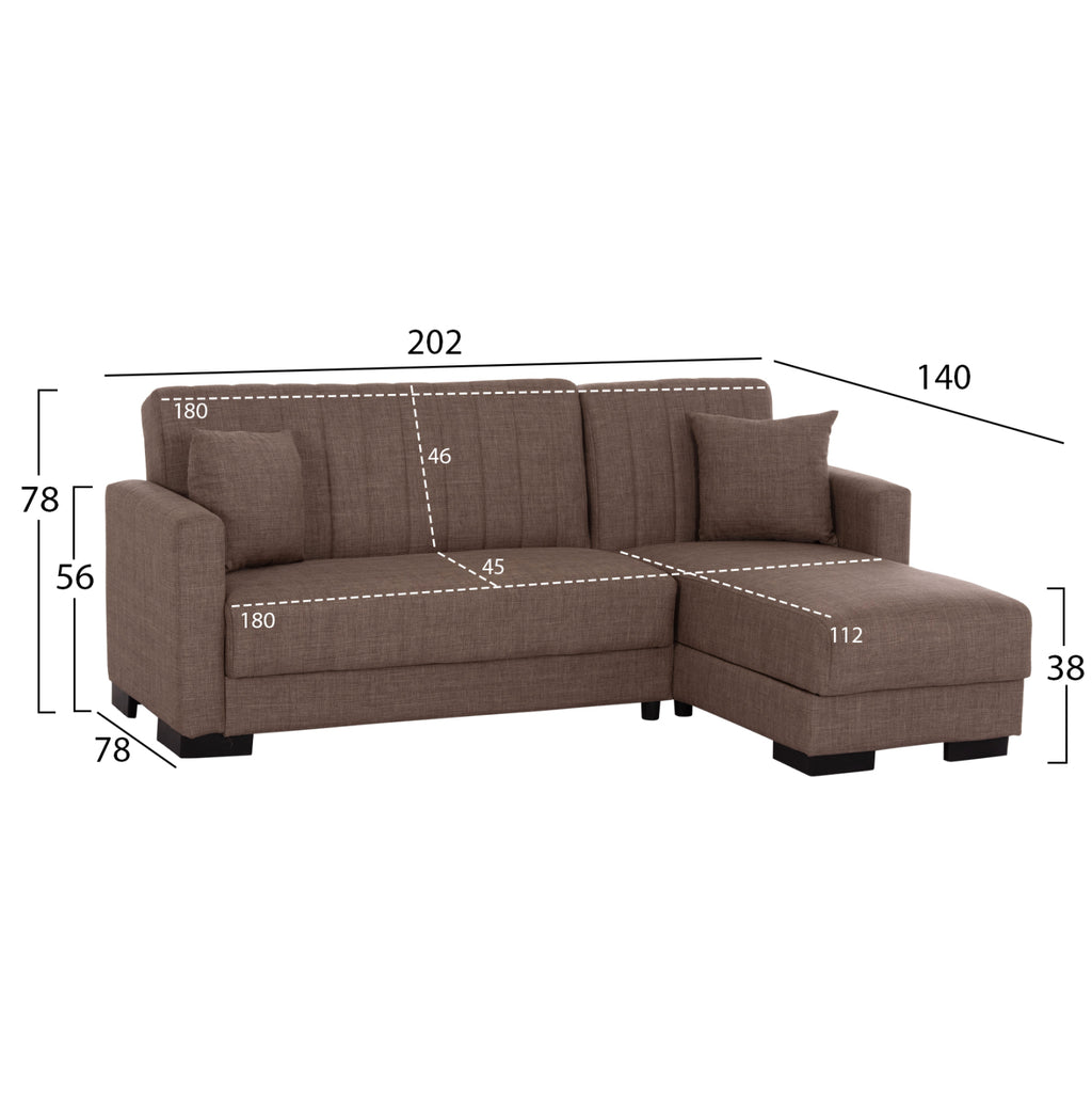 ΜΕ3244.02 е удобен и практичен ъглов диван. Цветът на тапицерията на целия диван е КАФЯВ, както и двете декоративни възглавници. Висококачествената материя на тапицерията има вертикални шевове само на гърба, докато пълнежът на седалката и облегалката е изработен от пяна, която предлага комфорт и правилна опора, ако се използва като легло. Защото това е основната характеристика на този диван. Освен че е ъглов диван, той се превръща и в легло чрез лесен за използване механизъм "клик-клак". И тъй като диванът може да се постави както в ляв, така и в десен ъгъл, неговата полезност и функционалност надхвърлят обичайното. И сякаш това не е достатъчно, под седалките има места за съхранение, които винаги са полезни във всеки дом, независимо къде е поставен диванът. Друга страхотна характеристика на дивана е, че страната, която образува ъгъла, може да се "отреже" и да се използва като отделен фотьойл или кресло! И накрая, краката на дивана са широки и ниски, което придава твърдост на цялата конструкция. РАЗМЕРИ: 202x140x78Y см. Размери на седалката: 180x45-112 см. Размери на облегалката: 180x46 см. Височина на подлакътниците: 56 см. Височина на седалката: 38 см. Височина на краката: 7 см. Размери на леглото: 120x100 см. (основната част) 60x165 см. (ъгълът) Място за съхранение: 105x60x12Y см. (в основната част) 56x63x12Y см. (в ъгъла) 47x60x12Y см. (в ъгъла) МАТЕРИАЛИ ЗА КОНСТРУКЦИЯ: Рамката на дивана е дървена, а механизмът на леглото е метален за голяма издръжливост при продължителна употреба. Тапицерията на леглото е изработена от висококачествен плат, а пълнежите както на седалката, така и на облегалката са изработени от пяна със средна твърдост, която предлага комфорт и качествен сън, когато се превърне в легло. Краката са ниски и изработени от подсилен полиетилен, за отлична устойчивост на тегло и влага. ПОДДРЪЖКА: Висококачествените материали, от които е изработен диванът, го правят лесен за употреба и, разбира се, лесен за поддръжка. Редовно почистване с влажна кърпа ще придаде на дивана вид на нов. ПРЕДИМСТВА: • Отлично качество на материалите • Удобна седалка • Преобразуване в легло с лесен механизъм • Ъглова седалка с възможност за обръщане • Здрави крака • Място за съхранение под седалката • Декоративни възглавници • Удобни размери за транспорт, тъй като е сглобен от 3 части. Основна седалка, ъглова седалка и подлакътници. "Търговска марка"