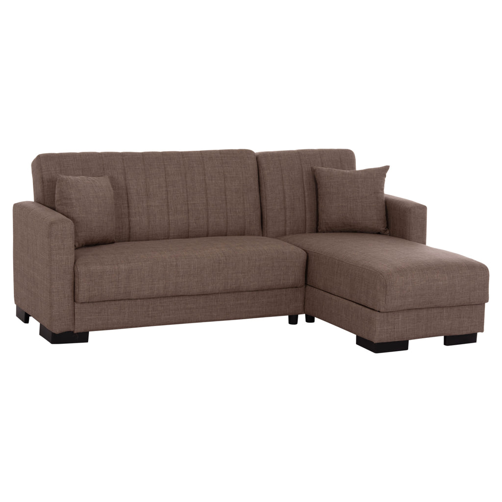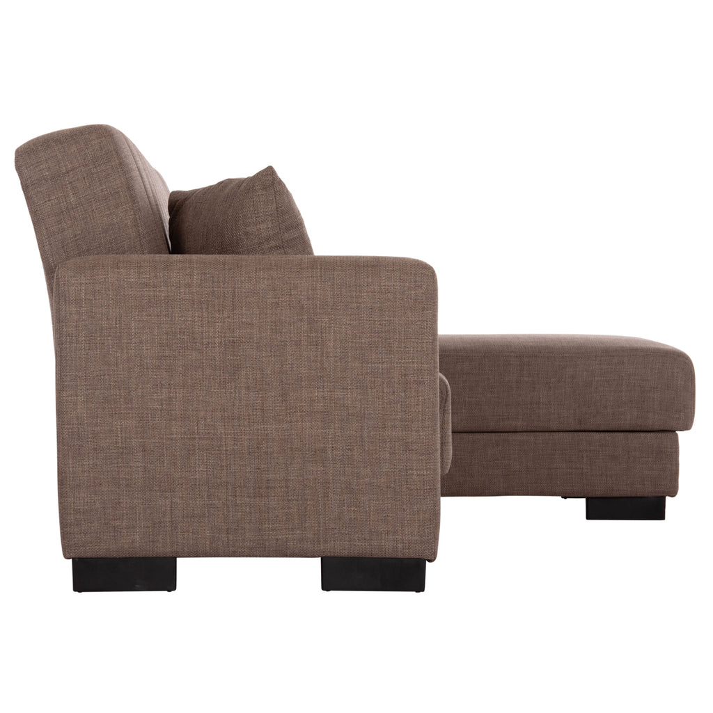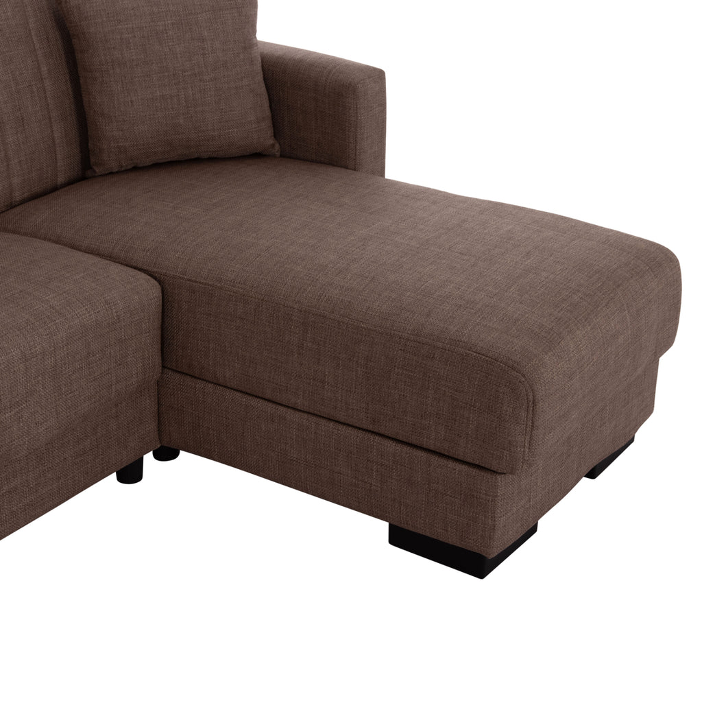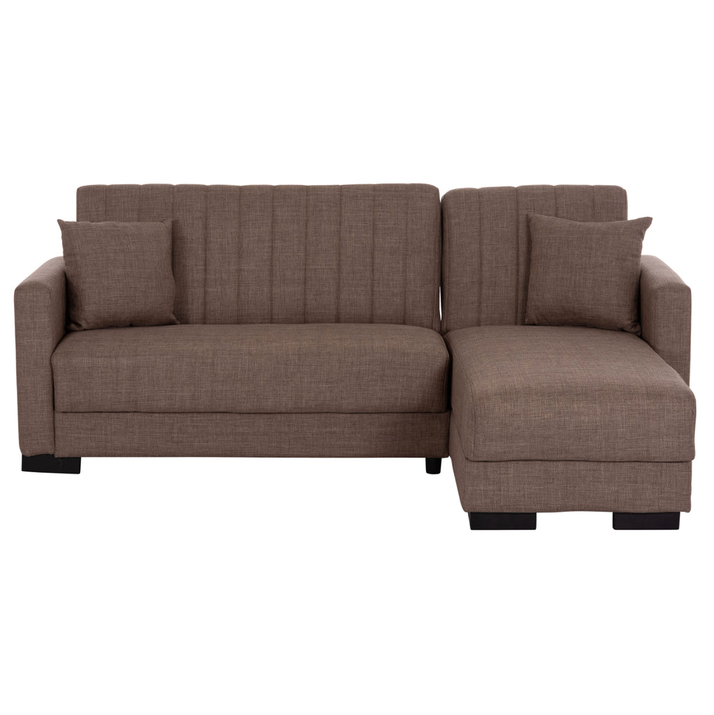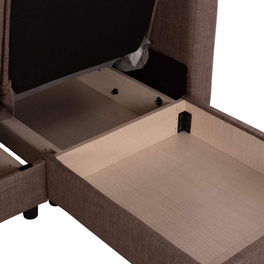 ΜΕ3244.02 е удобен и практичен ъглов диван. Цветът на тапицерията на целия диван е КАФЯВ, както и двете декоративни възглавници. Висококачествената материя на тапицерията има вертикални шевове само на гърба, докато пълнежът на седалката и облегалката е изработен от пяна, която предлага комфорт и правилна опора, ако се използва като легло. Защото това е основната характеристика на този диван. Освен че е ъглов диван, той се превръща и в легло чрез лесен за използване механизъм "клик-клак". И тъй като диванът може да се постави както в ляв, така и в десен ъгъл, неговата полезност и функционалност надхвърлят обичайното. И сякаш това не е достатъчно, под седалките има места за съхранение, които винаги са полезни във всеки дом, независимо къде е поставен диванът. Друга страхотна характеристика на дивана е, че страната, която образува ъгъла, може да се "отреже" и да се използва като отделен фотьойл или кресло! И накрая, краката на дивана са широки и ниски, което придава твърдост на цялата конструкция. РАЗМЕРИ: 202x140x78Y см. Размери на седалката: 180x45-112 см. Размери на облегалката: 180x46 см. Височина на подлакътниците: 56 см. Височина на седалката: 38 см. Височина на краката: 7 см. Размери на леглото: 120x100 см. (основната част) 60x165 см. (ъгълът) Място за съхранение: 105x60x12Y см. (в основната част) 56x63x12Y см. (в ъгъла) 47x60x12Y см. (в ъгъла) МАТЕРИАЛИ ЗА КОНСТРУКЦИЯ: Рамката на дивана е дървена, а механизмът на леглото е метален за голяма издръжливост при продължителна употреба. Тапицерията на леглото е изработена от висококачествен плат, а пълнежите както на седалката, така и на облегалката са изработени от пяна със средна твърдост, която предлага комфорт и качествен сън, когато се превърне в легло. Краката са ниски и изработени от подсилен полиетилен, за отлична устойчивост на тегло и влага. ПОДДРЪЖКА: Висококачествените материали, от които е изработен диванът, го правят лесен за употреба и, разбира се, лесен за поддръжка. Редовно почистване с влажна кърпа ще придаде на дивана вид на нов. ПРЕДИМСТВА: • Отлично качество на материалите • Удобна седалка • Преобразуване в легло с лесен механизъм • Ъглова седалка с възможност за обръщане • Здрави крака • Място за съхранение под седалката • Декоративни възглавници • Удобни размери за транспорт, тъй като е сглобен от 3 части. Основна седалка, ъглова седалка и подлакътници. "Търговска марка"
