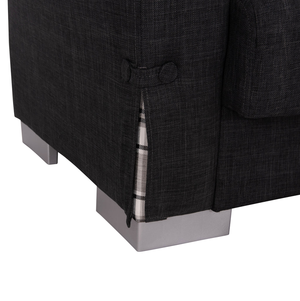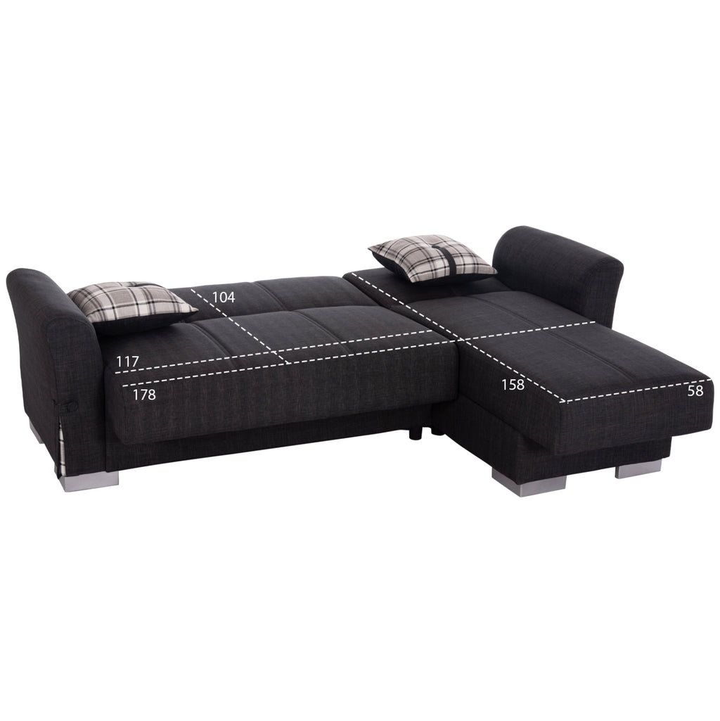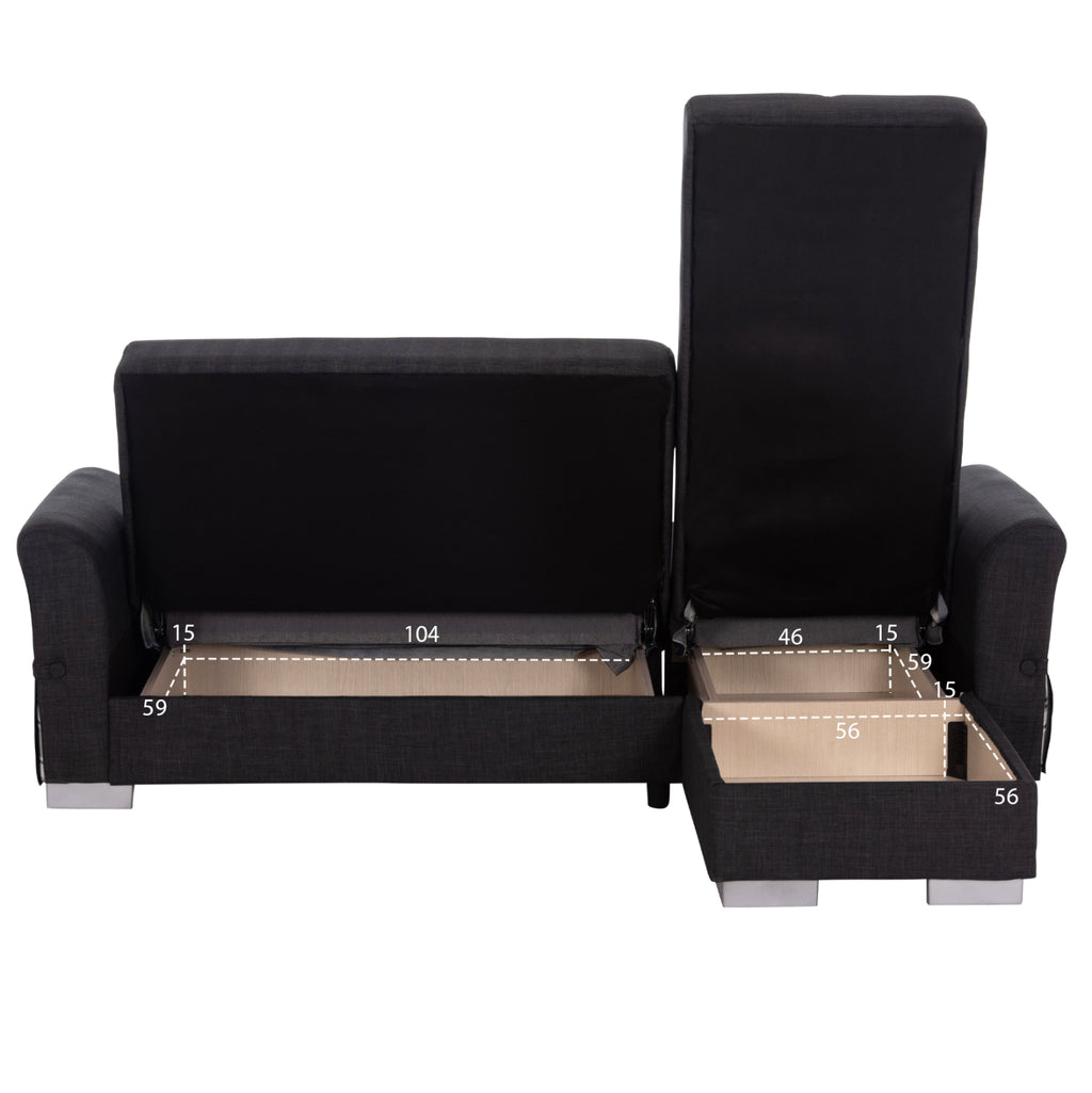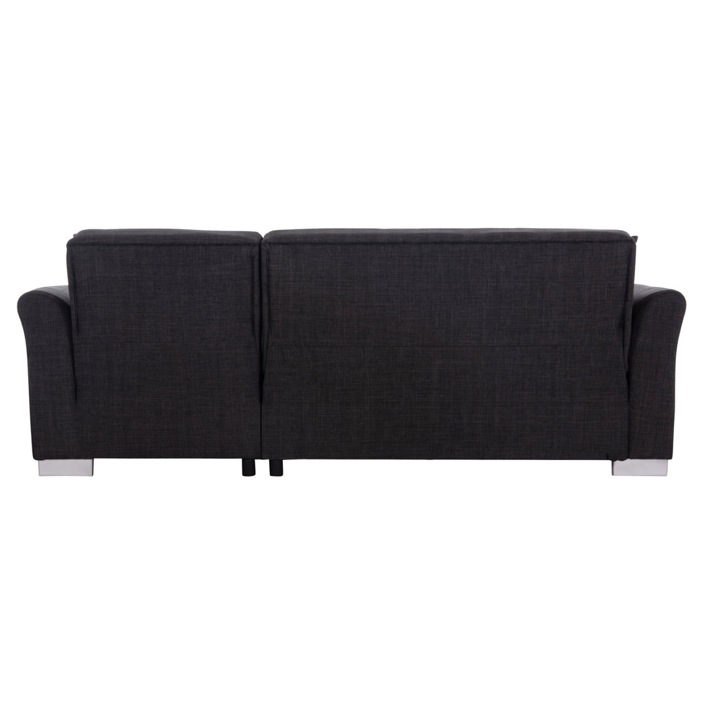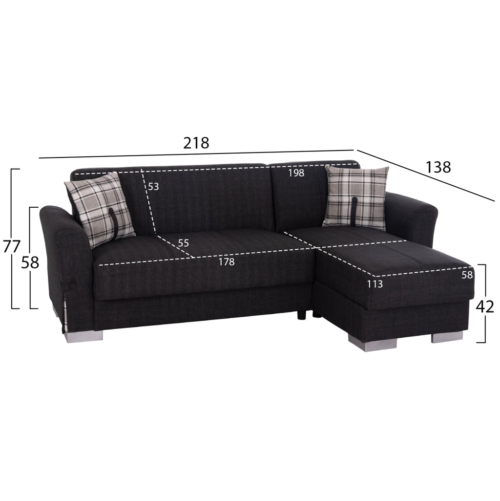 BRONKO е триместен ъглов и обръщаем разтегателен диван, който може да се адаптира към изискванията на вашето пространство, представлявайки интелигентно и практично предложение за пестене на място в офиса или дома. Тапицерията му е с висококачествен плат CHARCOAL, а подлакътниците са достатъчно широки, за да предложат комфорт и опора. Предлага се и с две възглавници в красив светло сив цвят. Превръщането му в легло се извършва с лесен за използване механизъм "click-clack", който дори оставя "капака" отворен, така че можете лесно и безопасно да съхранявате или изваждате вещите си от местата за съхранение, което винаги е полезно, особено в студентските жилища. И накрая, краката на дивана са ниски в цвят SILVER. Диван, който е идеален избор за тези от вас, които търсят нещо елегантно, функционално и качествено. РАЗМЕРИ: 218x83-138x77H см. Размери на седалката: 178x55-113 см. Размери на облегалката: 178x40 см. Височина на седалката: 42 см. Височина на подлакътниците: 58 см. Размери на леглото: 178x104-158 см. 117x104 + 58x158 Размери на пространството за съхранение: 104x59x15В см. 56x56x15В см. 46x59x15В см. МАТЕРИАЛИ ЗА ИЗРАБОТКА: Рамката на дивана е дървена, а механизмът на леглото е метален за голяма издръжливост при продължителна употреба. Тапицерията на леглото е изработена от висококачествен плат, а пълнежът както на седалката, така и на облегалката е от пяна със средна твърдост, която предлага комфорт и качествен сън, когато се превърне в легло. Краката са ниски и са изработени от подсилен полиетилен за отлична устойчивост на тегло и влага. ПОДДРЪЖКА: Висококачествените материали, използвани за изработката на дивана, го правят лесен за употреба и, разбира се, лесен за поддръжка. Редовното почистване с влажна кърпа ще придаде на дивана вид на нов. ПРЕДИМСТВА: • Преобразуване в легло с механизъм "клик-клак" • Място за съхранение • Обратимо • Удобни подлакътници • Големи размери *Продуктът се доставя несглобен във фабрична опаковка. ** Цветопредаването на продукта може леко да се различава от фотографското му представяне на вашия екран.
