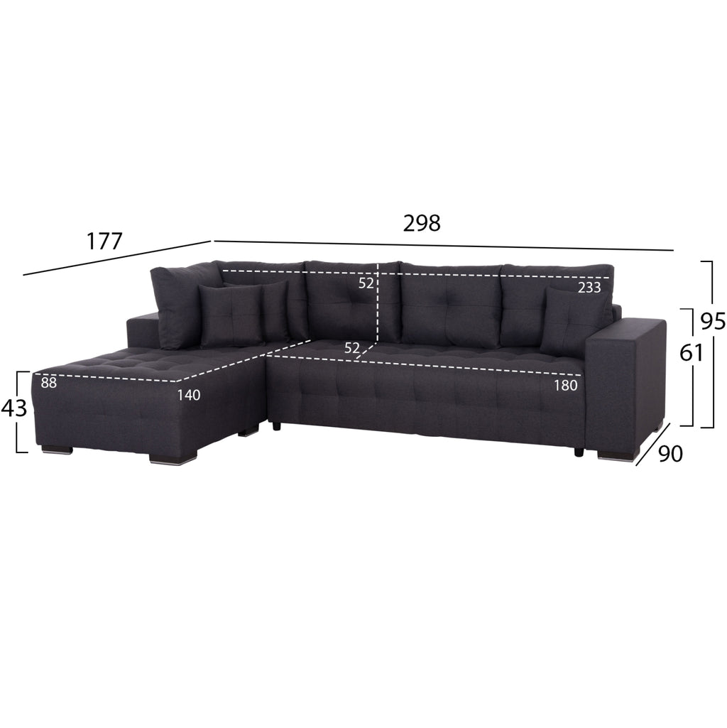 TRENDSTON е голям ъглов диван-легло (ЛЯВ ЪГЪЛ). Тапицерията му е с висококачествен СИВ плат с капитониран стил както на възглавниците, така и на седалката, а краката са изключително ниски. Разполага с 5 големи възглавници за облегалката и 3 по-малки декоративни. Леглото се оформя чрез издърпване на седалката на основния диван, като едновременно с това късата облегалка се "хвърля" напред. Така се създава изключително задоволително пространство за съхранение. И накрая, подлакътникът от лявата страна е широк и удобен, допълвайки по най-добрия начин несравнимата практичност на този прекрасен диван. РАЗМЕРИ: 298x90-177x95В см. Размери на седалката: 180-230x52-88x140 см. Размери на облегалката: 233x52 см. 65x52 см. Височина на подлакътниците: 61 см. Височина на седалката: 43 см. Височина на краката: 5 см. Размери на леглото: 180x135 см. Размери на пространството за съхранение: 177x56x24В см. С ЕДИН ПОГЛЕД: • Отлично качество на материалите • Седалките са с джобни пружини за несравним комфорт • Трансформира се в легло • Задоволително пространство за съхранение • Широк подлакътник • Големи размери • Ниски крака * Диванът се доставя несглобен във фабрична опаковка ** Цветопредаването на продукта може леко да се различава от фотографското му изображение на вашия екран.