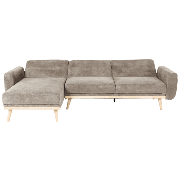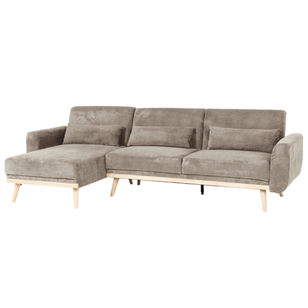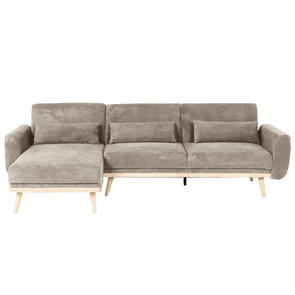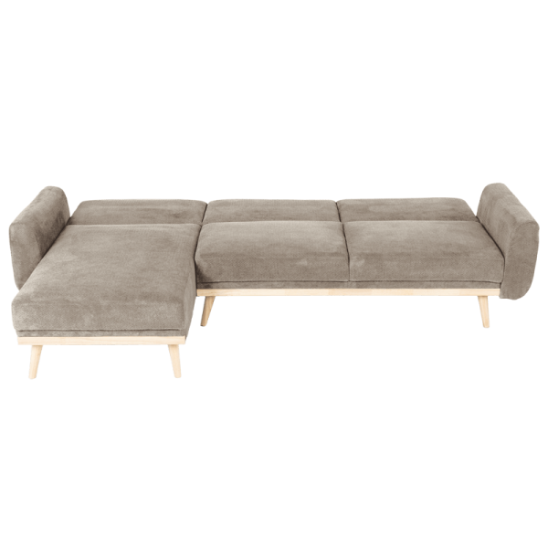 Ъгловият диван VIVI съчетава елегантен силует с висока функционалност. Конструкцията от метал и дърво гарантира здравина, а седалката и облегалката са изцяло с пълнеж от покет пружини и висококачествен пенополиуретан за комфорт през целия ден. Механизмът клик-клак позволява бързо и лесно трансформиране в удобно легло с площ за сън 248 x 108 см. Включени са и три декоративни възглавници с калъфи с цип – лесни за сваляне и пране. Естествените дървени крака подчертават модерната визия на модела.