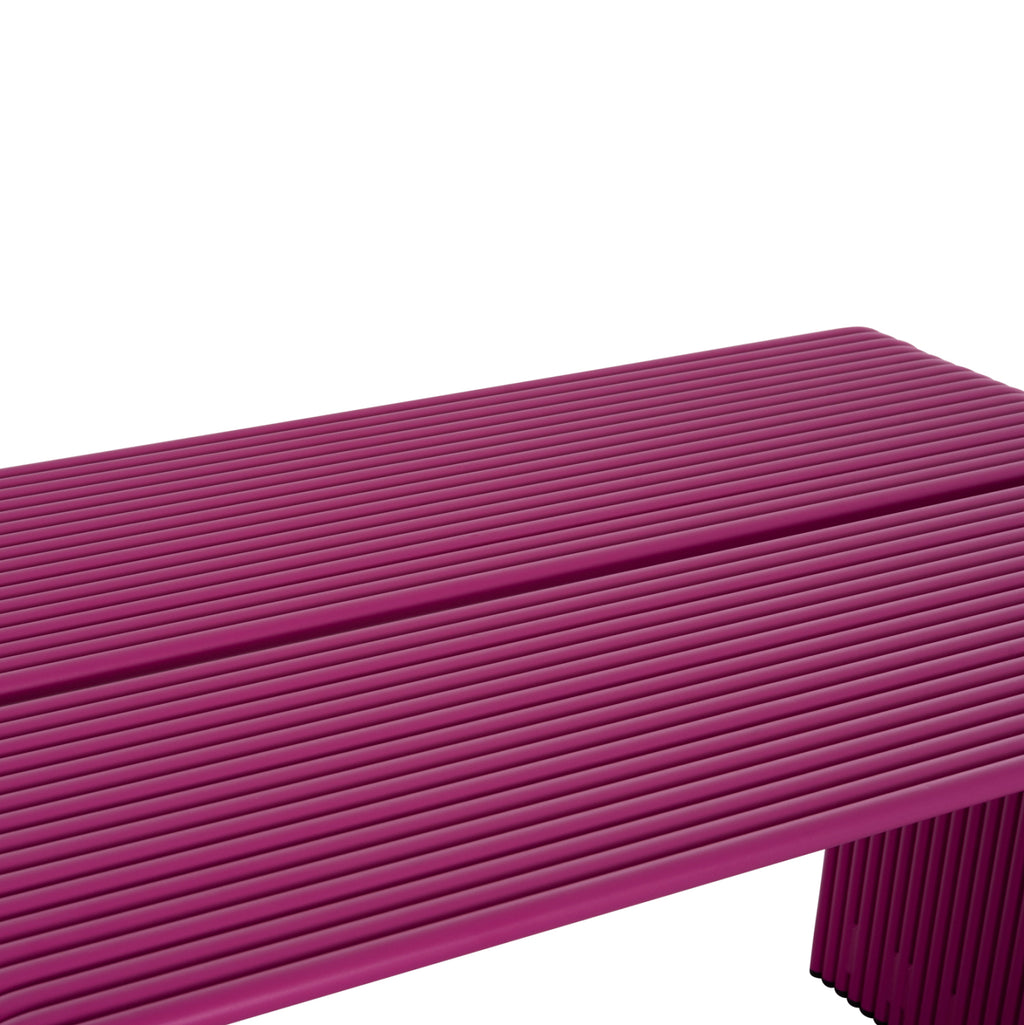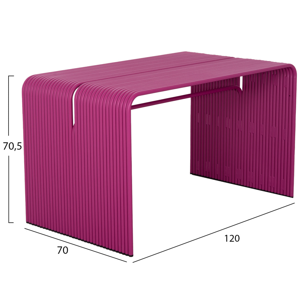 INTREPID е много специална трапезна маса, изработена изцяло от алуминиеви тръби в ярък ЛИЛАВ цвят, с пластмасови капачки в долната част на краката. Уникално и модерно предложение за външно пространство! РАЗМЕРИ: 120x70x70.5H см. Разстояние между краката: 121-117x70 см. КОНСТРУКТИВНИ МАТЕРИАЛИ: Алуминият е "зелен" материал, който може да се рециклира неограничено дълго време, като запазва характеристиките си без влошаване на качеството. По своята същност алуминият е устойчив на корозия. Информация: Електростатичното боядисване е процес на сухо покритие, използван като метално покритие. ПОДДРЪЖКА: Почиства се лесно с влажна кърпа. Не използвайте химически почистващи препарати. ** Цветопредаването на продукта може леко да се различава от неговото фотографско представяне на вашия екран.