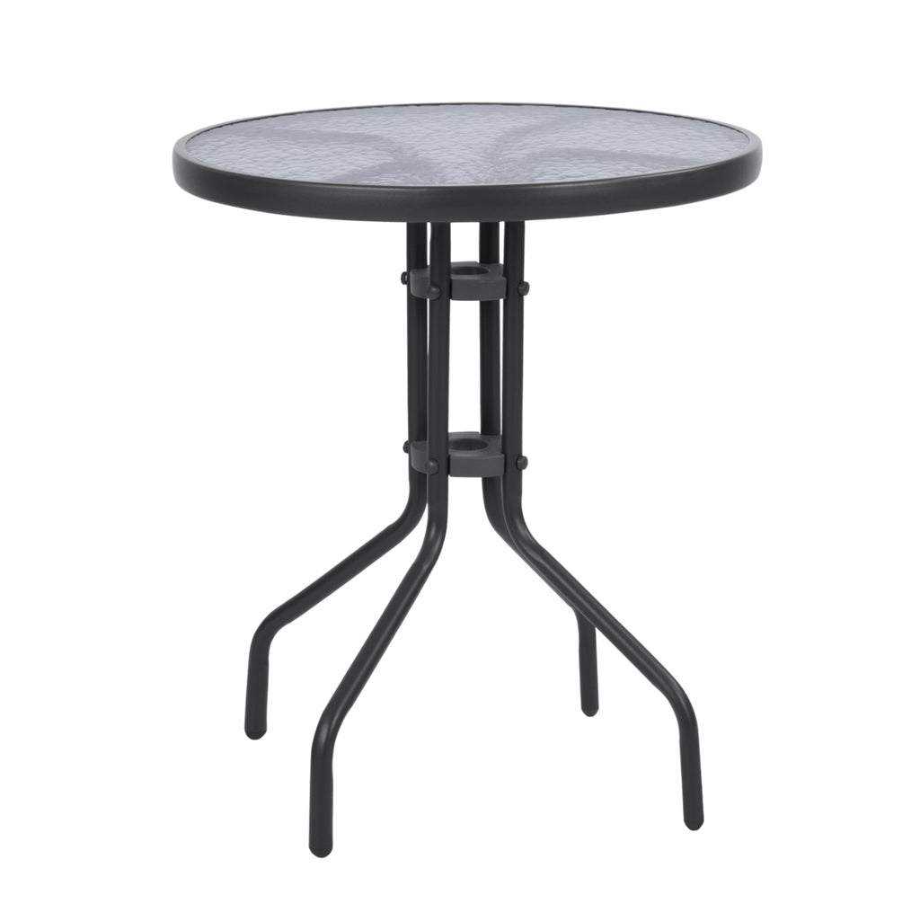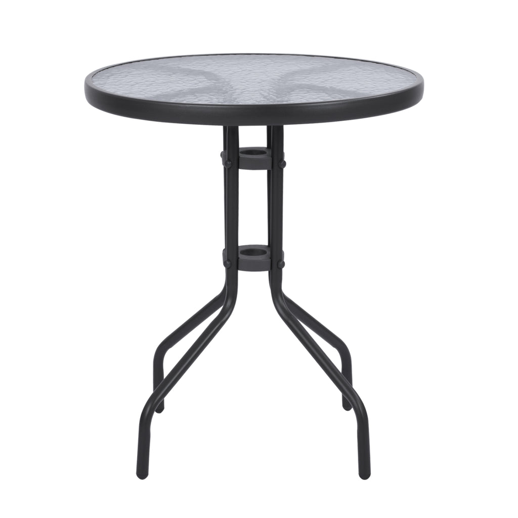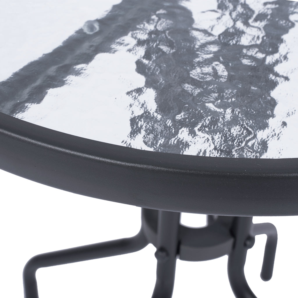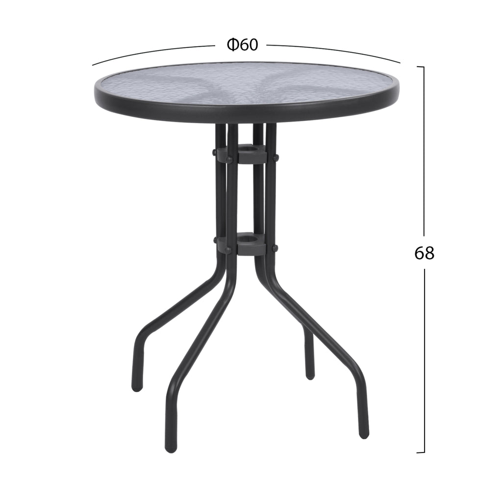 Външна маса от сив метал с безопасно стъкло на повърхността. Размери: Φ60x68H см. Разстояние между краката: 40х40 см. Цвят на метала: Сив Стъклото е с водни вълнички. Име: Lima Продуктът се предлага в разглобена опаковка, има инструкции за сглобяване в опаковката.