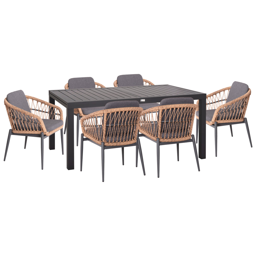 Този комплект за хранене на открито се състои от ТЪМНО СИВА разтегателна алуминиева маса и 6 ТЪМНО СИВИ алуминиеви фотьойла с тъмно СИВИ възглавници и тапицерия от синтетичен ратан в ЕСТЕСТВЕН цвят. РАЗМЕРИ: МАСА: 160-240x90x73В см. Разстояние между краката: 148x80 см. Спецификации на алуминия: 60x60x1.2 мм---- 65x35x1.5 мм ФОТОГРАФИ: 61x65x76-82В см. Размери на седалката: 48x45 см. Размери на облегалката: 44x40 см. Височина на подлакътниците: 69 см. Височина на седалката: 49 см. Височина на краката: 36 см. Разстояние между краката: 58.5-55x56-52 см. Възглавници: калъфи от полиестерен материал Спецификации на алуминий: 38x19x1.2 мм----Крака: Φ32x1.5 мм Размери на PE ратан: 7 мм МАТЕРИАЛИ ЗА КОНСТРУКЦИЯ: МАСА: -Алуминий с електростатично боядисване. Електростатичното боядисване е процес на сухо прахово боядисване, използван като метално покритие. ФОТОГРАФИ: --Алуминий с електростатично боядисване. Електростатичното боядисване е процес на сухо прахово боядисване, използван като метално покритие. -Тапицерията на креслото е изработена от PE ратан. Това означава, че тъканта е направена с висококачествени и издръжливи полиестерни влакна, устойчиви на екстремни метеорологични условия на топлина или студ, наподобяващи въже. ПОДДРЪЖКА: Достатъчно е едно минаване с влажна кърпа. Не използвайте химически почистващи препарати. Масата се доставя несглобена и е лесна за сглобяване, тъй като всичко необходимо е включено в опаковката.