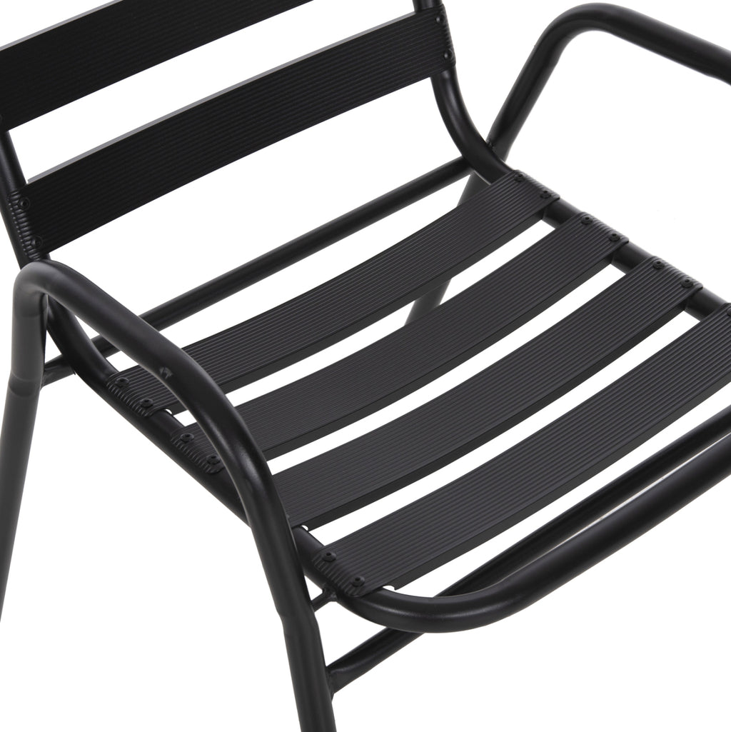 Този комплект за хранене на открито включва маса с ЧЕРНА метална рамка и ПОДСИЛЕН плот с матирано стъкло и 4 метални фотьойла, които могат да се подреждат една върху друга, с ЧЕРНА алуминиева седалка и облегалка. РАЗМЕРИ: МАСА: 110x60x71Y см. Метална рамка: Φ25x0.8mm дебелина. КРЕСЛА: 54x56x79Y см. Размери на седалката: 42,5х42 см. Размери на гърба: 42.5х41.5см. Височина на ръцете: 58,5 см. Височина на седалката: 41,5 см. Височина на крака: 39 см. Разстояние между краката: 44,5-49х51-55,5 см. Разстояние задни крака: 45.5-50.5 см. ПОДДРЪЖКА: От горното се вижда, че комплектът не се нуждае от специална поддръжка. Едно минаване с влажна кърпа или дори с меки препарати е достатъчно. **Масата се доставя в несглобен вид и се сглобява лесно, тъй като всички необходими части са включени в опаковката. *** Цветопредаването на продукта може леко да се различава от неговото фотографско представяне на вашия екран.