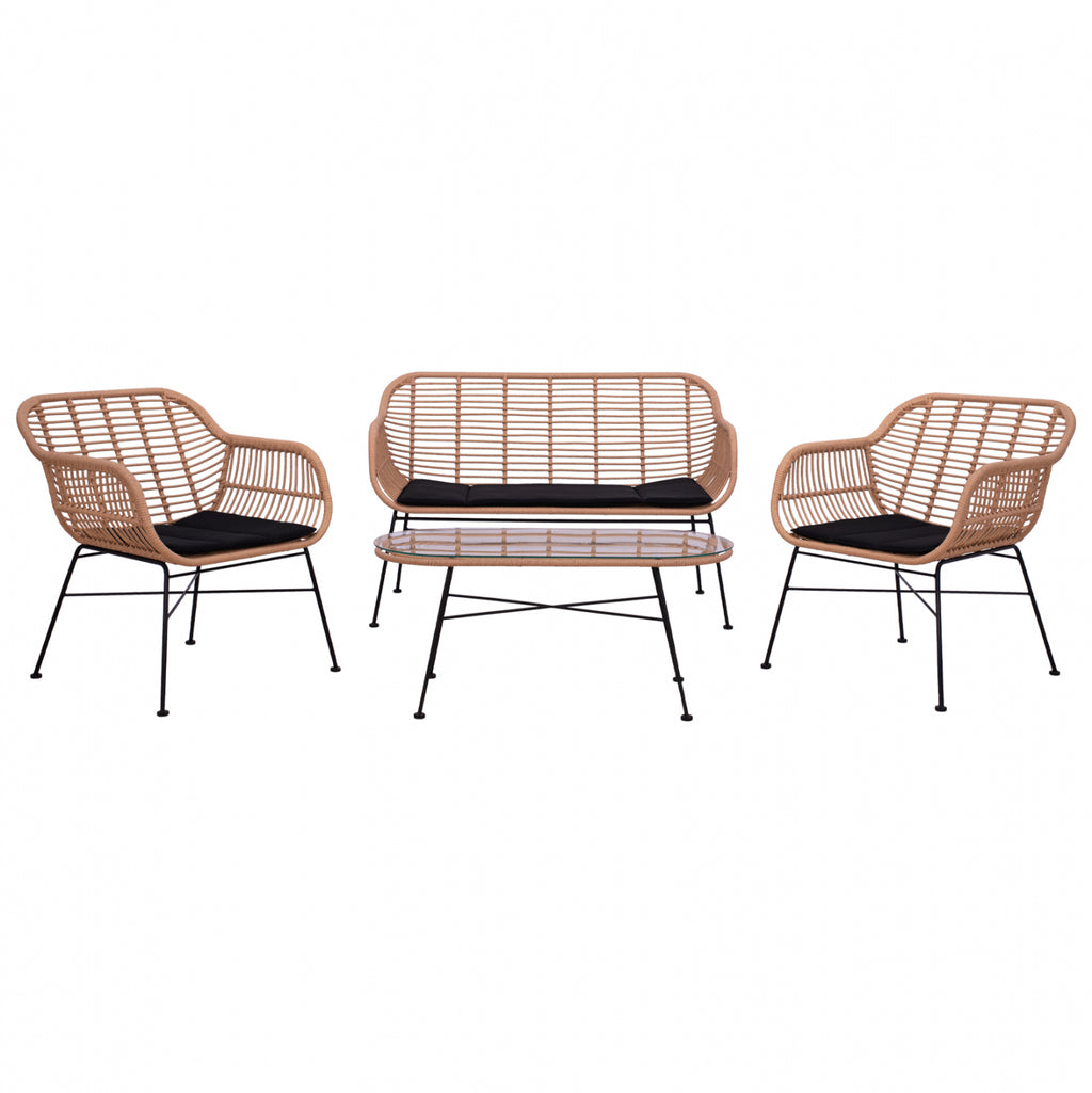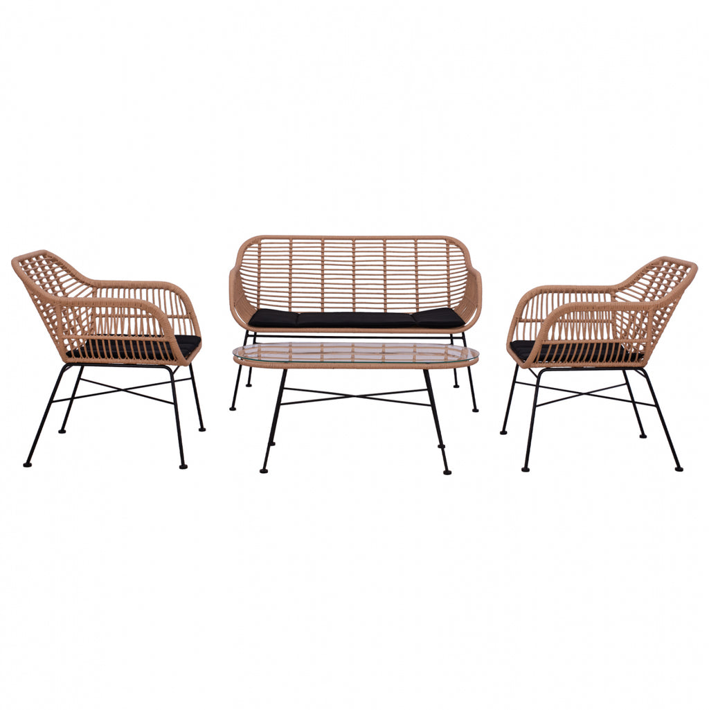 Цялостен хол 4 бр. изработена от метална рамка в черен нюанс, с плетена тапицерия в бежов нюанс и платнени възглавници в черен цвят. Комплектът включва: 1 двуместен диван, 2 фотьойла и 1 стъклена маса. Ракитата има голяма устойчивост на високи и ниски температури от (-85c до +85c.), обогатена е и с UV стабилизатор за слънчевите лъчи. Идеален за трапезария, но и за вашия дом, той ще ви даде комфорт и релакс. Двуместен диван с размери: 125х69х82 см. Височина на ръцете: 67,5 см. Височина на седалката: 43 см. Размери на седалката: 106х49 см. Размери на фотьойла: 70x69x82 см. Височина на ръцете: 67,5 см. Височина на седалката: 43 см. Размери на седалката: 51х49 см. Размери на масата: 100х45х44,5 см.