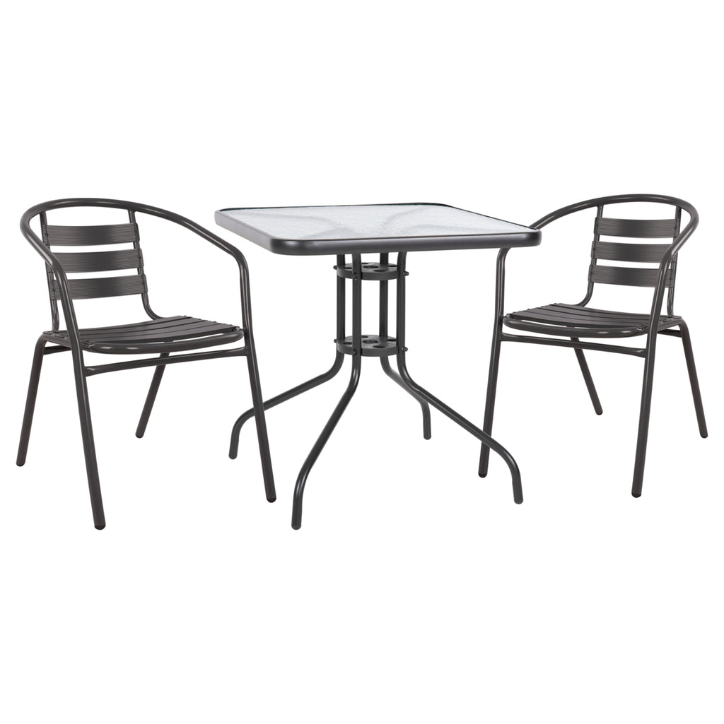Маса от метална конструкция в сив нюанс със стъклена повърхност.
