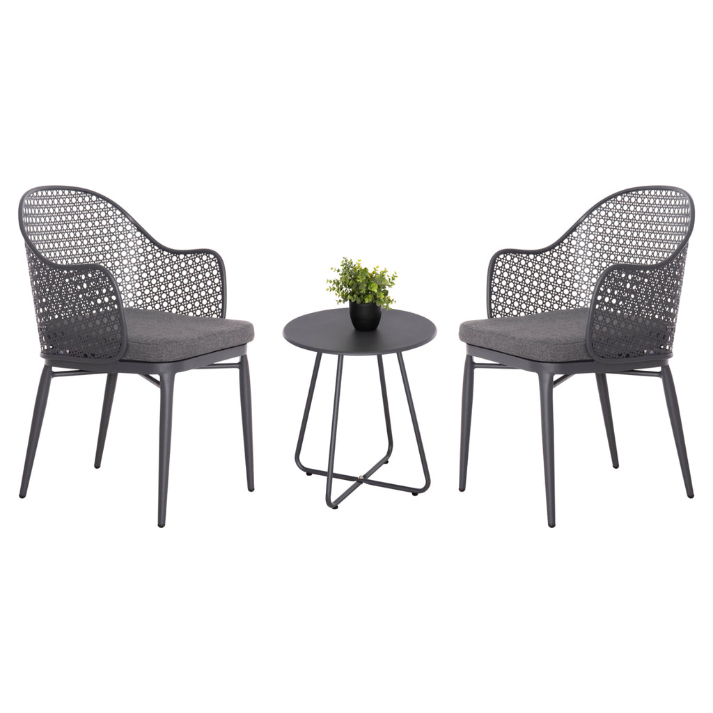 OREGO е външен лаундж комплект от 3 части, състоящ се от 2 алуминиеви фотьойла и кръгла метална маса, всички в ТЪМНО СИВ цвят. В подобен нюанс са и седалките на фотьойлите. РАЗМЕРИ: Маса: Φ40x50H см. Размери на метала: 16x1.2mm Фотьойли: 58x55x83Y cm. Дебелина на възглавницата: 5см. изработен от полиестерен материал Алуминий Спецификации: Φ32x1.2mm—Φ19x1.2mm ПОДДРЪЖКА: Почиствайте лесно с влажна кърпа. *Масата се доставя разглобена във фабрична опаковка **Точното цветопредаване на продукта може леко да се различава от действителния продукт поради различните настройки на всеки монитор.