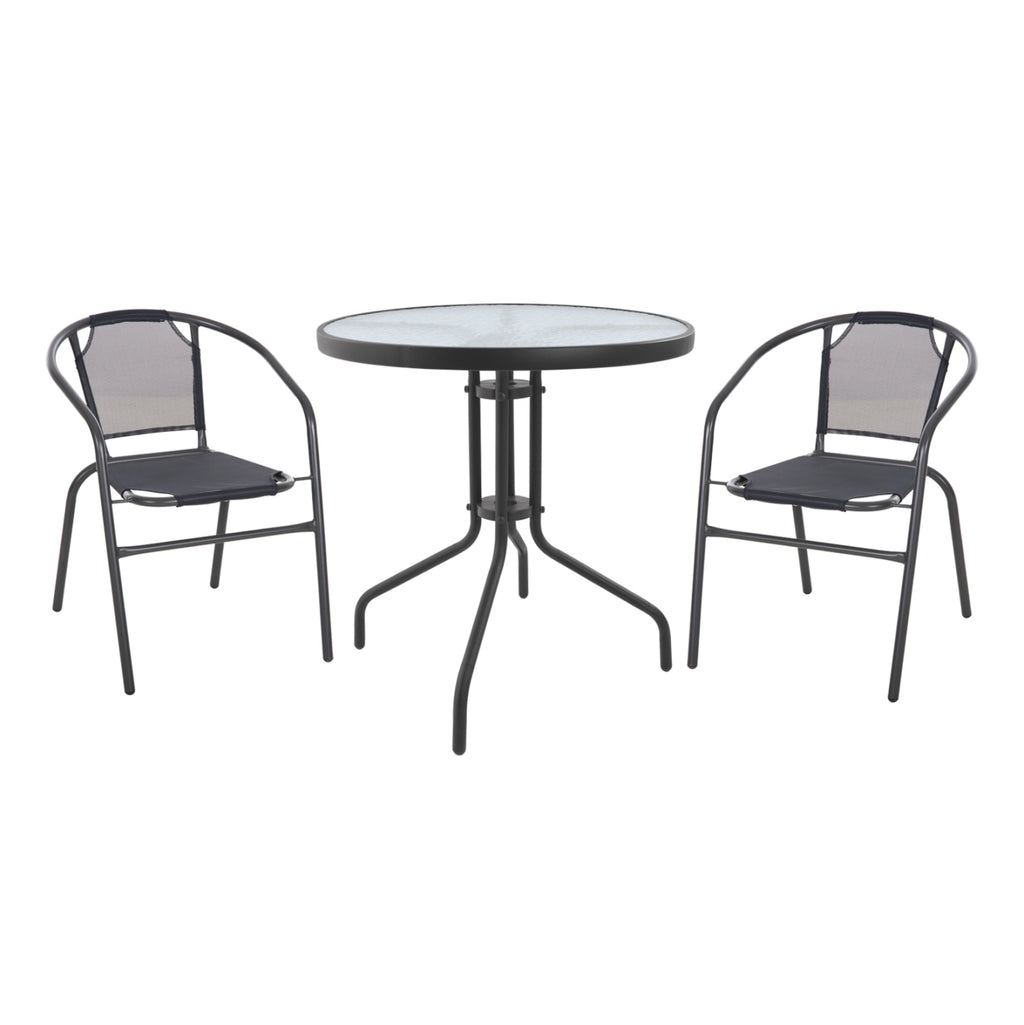 Този комплект се състои от 2 СИВИ метални стола с текстилна облегалка и седалка и СИВА кръгла маса с полупрозрачна повърхност от безопасно стъкло. Стъклената повърхност лежи върху метална колона с 4 крака с красива извита подредба. Столовете са леки и като цяло този комплект е идеален за ограничени пространства като тераси и малки дворове. РАЗМЕРИ: Маса: Φ70x70Y см. Столове: 55x58x72H см. Размери на седалката: 36х36 см. Размери на гърба: 30х31см. Височина на ръцете: 63 см. Височина на седалката: 43 см. Височина на крака: 39 см. Разстояние между краката: 50х58,5 см. Разстояние задни крака: 44,5 см. ПОДДРЪЖКА: Достатъчно е забърсване с влажна кърпа или дори със специални почистващи препарати. *Масата се доставя разглобена ** Цветопредаването на продукта може леко да се различава от фотографското представяне на вашия екран.