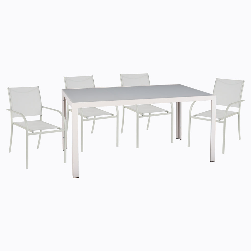 Външен комплект с маса с ICE WHITE метална конструкция и АРМИРАНА стъклена повърхност и 4 БЕЛИ метални фотьойла с БЯЛА текстилна дамаска. Масата е правоъгълна с класически дизайн. Фотьойлите са с дизайн със средно високи облегалки и високи подлакътници. РАЗМЕРИ: МАСА: 150x90x75Y см. КРЕСЛА: 56x60x88H см. Размери на седалката: 41х49 см. Размери на гърба: 47х39см. Височина на ръцете: 61,5 см. Височина на седалката: 44 см. Височина на крака: 39 см. Разстояние между краката: 56х56 см. МАТЕРИАЛИ НА ИЗРАБОТКАТА: Рамката на масата, както и на фотьойлите е метална с електростатично боядисване. Електростатичното боядисване е процес на сухо покритие, използван като метално покритие. Електростатичното боядисване е нанасяне на сух прах чрез електростатичен процес, който след това се „свързва“ към метала чрез топлина. Креслата са тапицирани с висококачествен textline (или textilene) 2x1. Това е дебел, здрав и издръжлив полиестерен плат. Това означава, че е направен от полиестерна прежда с PVC. Плотът е изработен от нечупливо стъкло или безопасно стъкло. Закаленото или "нечупливо" стъкло е вид безопасно стъкло около четири пъти по-здраво от обикновеното стъкло. И за разлика от обикновеното стъкло, което може да се пръсне на назъбени парчета, когато се счупи, закаленото стъкло се разбива на малки, относително безобидни гранулирани парчета. В резултат на това закаленото стъкло се използва в среди, където човешката безопасност е приоритет, като например жилищни приложения и др. ПОДДРЪЖКА: От горното може да се види, че комплектът не се нуждае от специална поддръжка. В допълнение към редовното почистване на прах, можете да избършете с влажна кърпа. КАКВО ХАРЕСВАМЕ: • Класически и вечен дизайн • Лесна поддръжка • Качествени строителни материали • Невероятно съотношение цена-качество Масата се доставя в несглобен вид и се сглобява лесно, тъй като всичко необходимо е включено в опаковката. ** Цветопредаването на продукта може леко да се различава от неговото фотографско представяне на вашия екран.