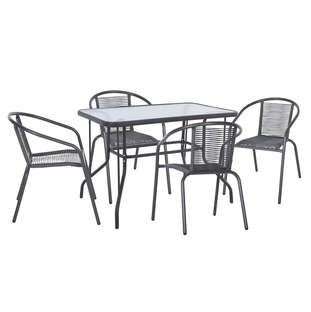 Този комплект за хранене на открито включва маса със СИВА метална рамка и матирано стъклено ПОДСИЛВАНЕ и 4 СИВИ метални фотьойла със седалка и облегалка от синтетичен ратан (подобни на въже) в СИВ цвят. РАЗМЕРИ: МАСА: 110x60x71Y см. Метална рамка: Φ25x0.8mm дебелина КРЕСЛА: Размери: 54x61x75Y cm. Размери на седалката: 40.5-31.5x40см. Размери на гърба: 33х36см. Височина на ръцете: 60-68 см. седалка: 43 см. Височина на крака: 40 см. Разстояние на краката: 49-53.5x54-58.5см. Разстояние между краката отзад: 42-47 см. Рамка: Φ24x0.80мм. дебелина ПОДДРЪЖКА: От горното се вижда, че комплектът не се нуждае от специална поддръжка. Едно минаване с влажна кърпа или дори с меки препарати е достатъчно. **Масата се доставя в несглобен вид и се сглобява лесно, тъй като всички необходими части са включени в опаковката. *** Цветопредаването на продукта може леко да се различава от неговото фотографско представяне на вашия екран.