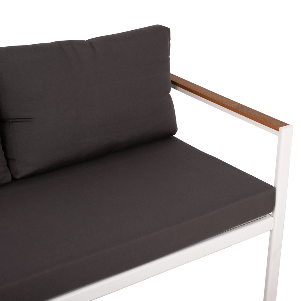 Повечето от нас търсят мебели за открито, които имат елегантен и вечен дизайн, здрава конструкция, лесни за транспортиране и почистване и накрая, издръжливи при всякакви метеорологични условия. Алуминиевите мебели представляват минималистичен стил на декорация и отговарят на горните изисквания. В същото време те са изключително устойчиви не само на атмосферни условия, но и на ръжда, така че не е необходимо да ги съхранявате през зимните месеци. Поддържат се лесно и се почистват много лесно. Цвят: Бяло - Сив Комплектът включва: Двуместен диван, два фотьойла с платнени възглавници и алуминиева маса с повърхност Polywood. Размери на дивана: 144х70х85см. Височина на седалката: 46 см. Височина на ръцете: 66 см. Размери на седалката: 133x52 см. Размери на фотьойла: 77x70x85 см. Височина на седалката: 46 см. Височина на ръцете: 66 см. Размери на седалката: 67x52 см. Размери на масата: 110х55х40 см. Дебелина на седалната възглавница: 10см. Дебелина на облегалката: 13см.