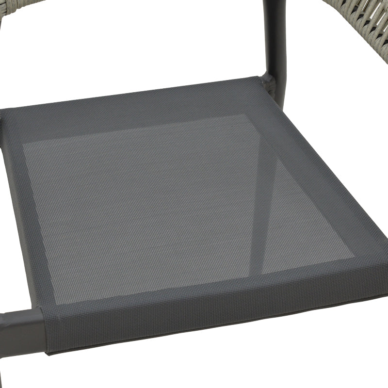 * Основно тяло на стола, изработено от мрежест плат с отлично качество и ратан. Основното свойство на ратан е неговата гъвкавост, тъй като може лесно да се тъче и оформя. Освен това е издръжлив и устойчив на атмосферни влияния, което го прави идеален за допълнителни външни пространства. Мрежестата тъкан е вид тъкан, характеризираща се със своята отвореност, т.е. наличието на малки дупчици или мрежи, които пропускат въздуха и светлината.
