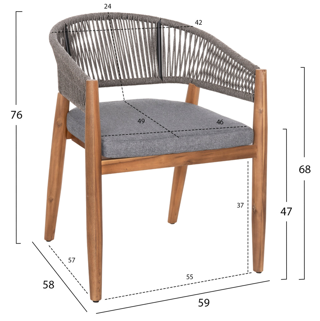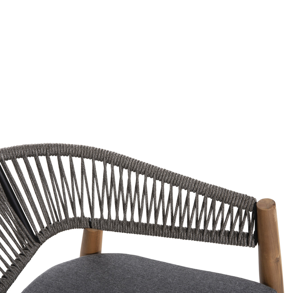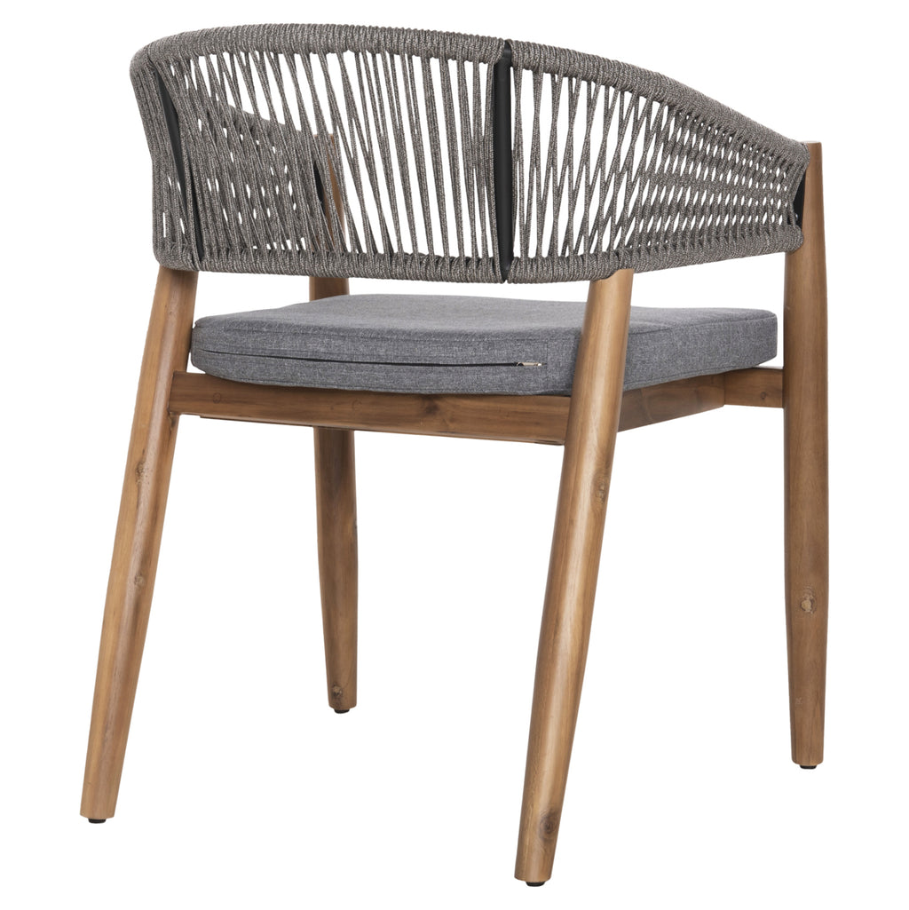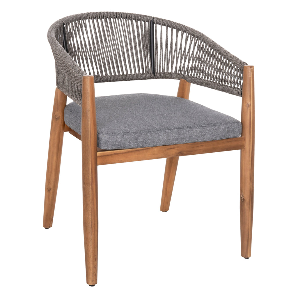 Външният стол за хранене NAVAN хармонично съчетава различни строителни материали. Краката са изработени от акациево дърво в естествения му цвят, а задната рамка е метална с оплетка от найлоново въже в СИВ цвят. Седалката е с възглавница от полиестерен плат също в СИВ цвят. Линиите на дизайна са елегантни и лесни за употреба и ще бъде център на вниманието, където и да бъде поставен, особено ако се комбинира със съответната маса.