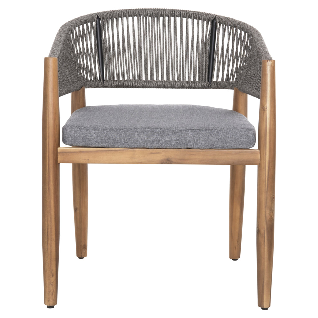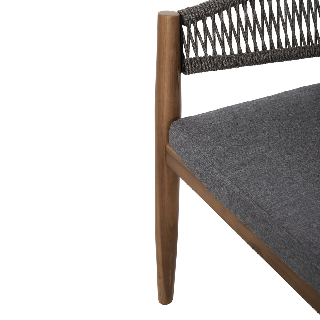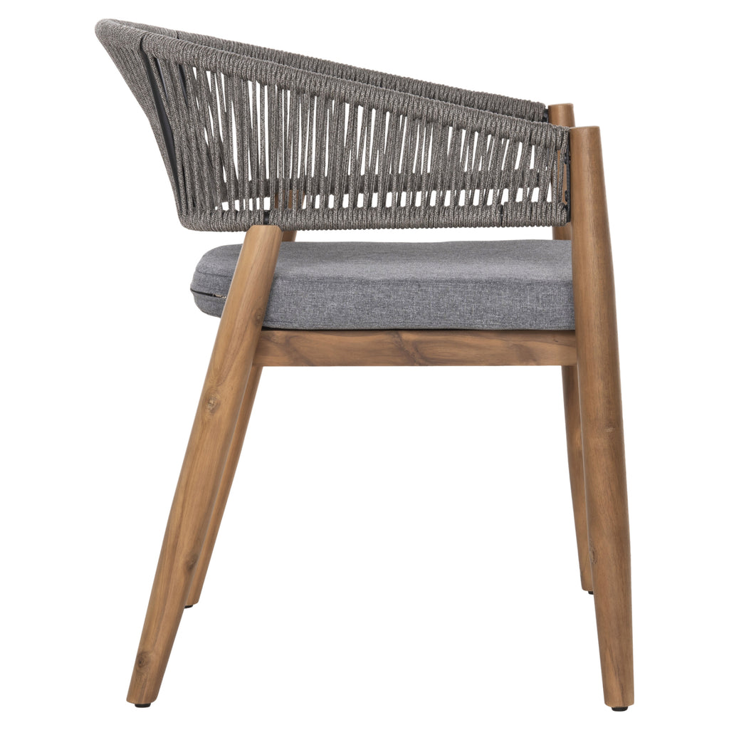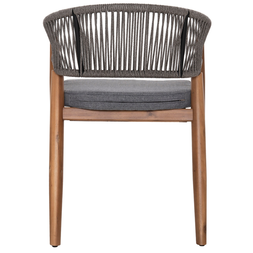 Външният стол за хранене NAVAN хармонично съчетава различни строителни материали. Краката са изработени от акациево дърво в естествения му цвят, а задната рамка е метална с оплетка от найлоново въже в СИВ цвят. Седалката е с възглавница от полиестерен плат също в СИВ цвят. Линиите на дизайна са елегантни и лесни за употреба и ще бъде център на вниманието, където и да бъде поставен, особено ако се комбинира със съответната маса.