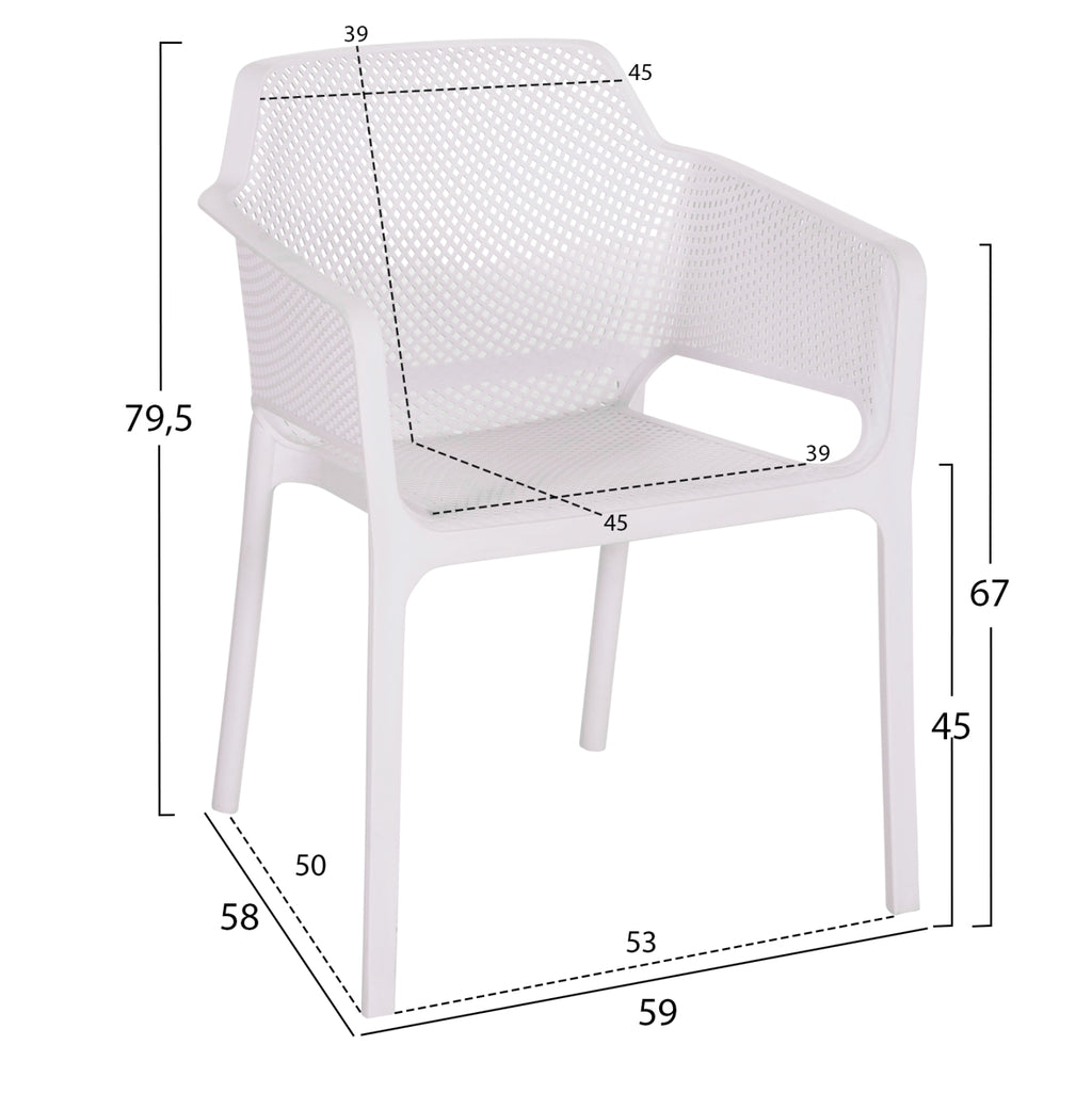 Полипропиленовото кресло WHITE JOHN е идеалното предложение за използване във външни пространства, независимо дали професионални (банкети, кетъринг компании и др.) или за дома. Състои се от формован "перфориран" комплект седалка-облегалка-подлакътници-крака за по-добра вентилация, докато ръцете са високи и сравнително широки, което води до комфорт по време на употреба. Освен това облегалката и седалката със средна височина са с добър размер и със сигурност ще зарадват всеки, който седне в това кресло. РАЗМЕРИ: 59x58x79.5H см. Размери на седалката: 39х45 см. Размери на гърба: 45х39см. Височина на ръцете: 67см. Височина на седалката: 45 см. Разстояние между краката: 53х50 см. МАТЕРИАЛ НА ИЗРАБОТКА: Креслото е изработено от 100% висококачествен полипропилен. Полипропиленът е особено устойчив на тегло и вода, като същевременно има голяма устойчивост на температури до 125 градуса по Целзий. Освен това неговата издръжливост не се ограничава до тегло, вода и температура, но е необичайно устойчив на много химически разтворители и киселини. ПОДДРЪЖКА: Мебелите от полипропилен се почистват лесно с влажна кърпа. Ако са на открито, могат да се почистват директно с течаща вода. ПРЕДИМСТВА: •Удобен размер - практичност •Издръжливост •МОЖЕ ДА СЕ СРЕЩА •Екологичен •Съотношение цена-качество ** Цветопредаването на продукта може леко да се различава от фотографското представяне на вашия екран.