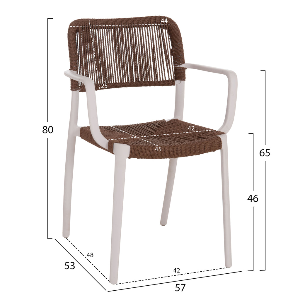 Πολυθρόνα Τραπεζαρίας Εξωτερικού Χώρου STRIDER Η πολυθρόνα τραπεζαρίας εξωτερικού χώρου STRIDER συνδυάζει σύγχρονη αισθητική και πρακτικότητα, αποτελώντας ιδανική επιλογή για βεράντες, κήπους και επαγγελματικούς εξωτερικούς χώρους. Ο ανθεκτικός σκελετός από πολυπροπυλένιο σε ΛΕΥΚΗ απόχρωση συνδυάζεται αρμονικά με κάθισμα και πλάτη από ΚΑΦΕ σχοινί, προσφέροντας μοντέρνο χαρακτήρα και άνεση. ________________________________________ ΔΙΑΣΤΑΣΕΙΣ •Συνολικές διαστάσεις: 57x53x80Υ εκ. •Διαστάσεις καθίσματος: 42x45 εκ. •Διαστάσεις πλάτης: 44x25 εκ. •Ύψος μπράτσων: 65 εκ. •Ύψος καθίσματος: 46 εκ. •Απόσταση ποδιών: 42x48 εκ. ________________________________________ ΥΛΙΚΑ ΚΑΤΑΣΚΕΥΗΣ •Σκελετός από πολυπροπυλένιο υψηλής αντοχής. •Κάθισμα και πλάτη από συνθετικό σχοινί σε καφέ απόχρωση. •Κατάλληλη για εξωτερική χρήση με αντοχή στην υγρασία και στην ηλιακή ακτινοβολία. ________________________________________ ΣΥΝΤΗΡΗΣΗ •Καθαρίζεται εύκολα με μαλακό πανί και ήπιο σαπούνι. •Δεν απαιτεί ειδική συντήρηση. •Συνίσταται η αποφυγή λειαντικών καθαριστικών. ________________________________________ ΠΛΕΟΝΕΚΤКГΑΤΑ •Σύγχρονος σχεδιασμός που ταιριάζει σε κάθε εξωτερικό χώρο. •Ανθεκτική κατασκευή για καθημερινή χρήση. •Άνετο κάθισμα με σωστή εργονομία. •Ιδανική επιλογή για οικιακούς και επαγγελματικούς χώρους. •Εξαιρετική σχέση ποιότητας-τιμής (value for money). ** Η χρωματική απόδοση του προϊόντος ενδέχεται να διαφέρει ελαφρώς σε σχέση με την φωτογραφική απεικόνισή του στην οθόνη σας.