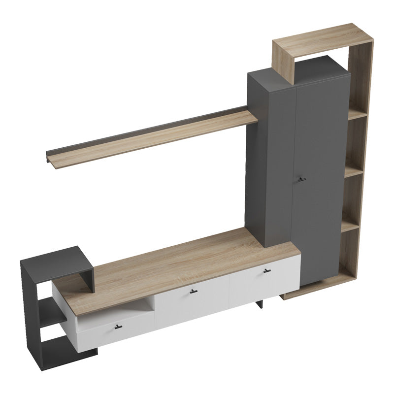 Тази впечатляваща и луксозна композиция съчетава достатъчно място за съхранение с модерен дизайн, съчетавайки топлината на дървесния тон Sonoma, елегантността на сивото и яркостта на бялото.