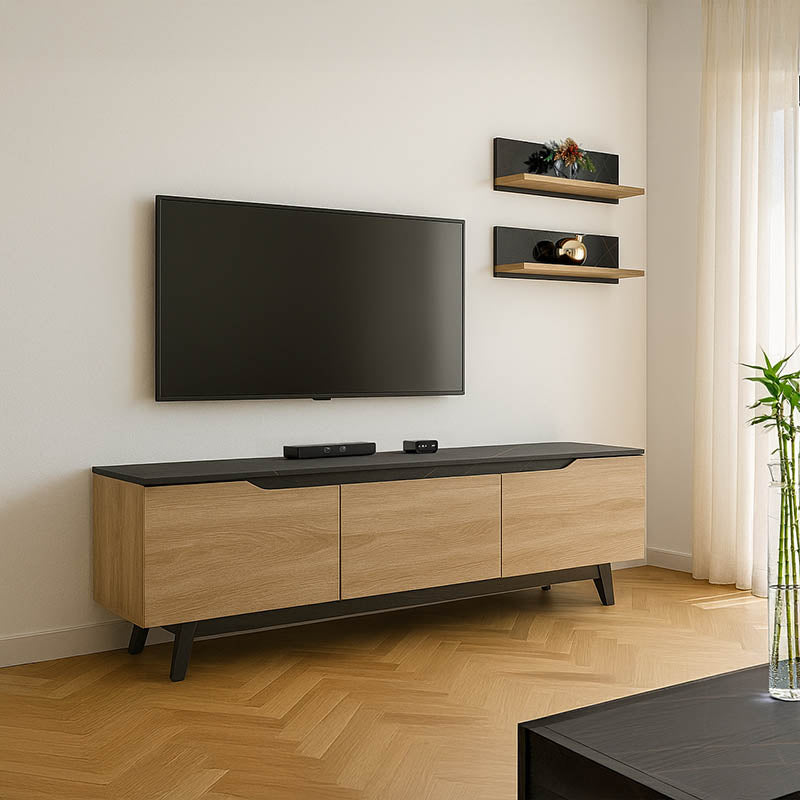 Модерният и елегантен хол Kasia е отлично допълнение към всеки съвременен дом. Комбинацията от дърво с мраморно покритие добавя усещане за лукс и топлина в пространството. Комплектът е допълнен с два стенни рафта за излагане на любимите ви декоративни елементи. Технически характеристики: Изработени от висококачествени ПДЧ с меламиново покритие, устойчиви на износване и повреди. Предлага се в цветова комбинация от сонома и черен мрамор. Разполага с три шкафа и рафтове за съхранение на дребни предмети и декорации. Размери на продукта: Дължина: 180 см Ширина: 35 см Височина: 48,5 см Размери на рафта: Дължина: 60 см Ширина: 15 см Височина: 15 см Забележки: Продуктът се доставя във фабрична опаковка с подробно ръководство за монтаж. Цветовият нюанс на продукта може леко да се различава от фотографското му представяне на вашия екран.