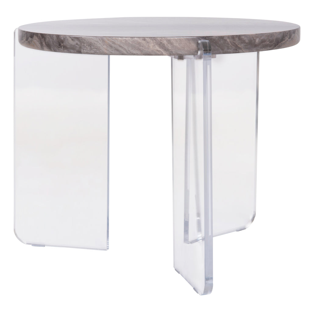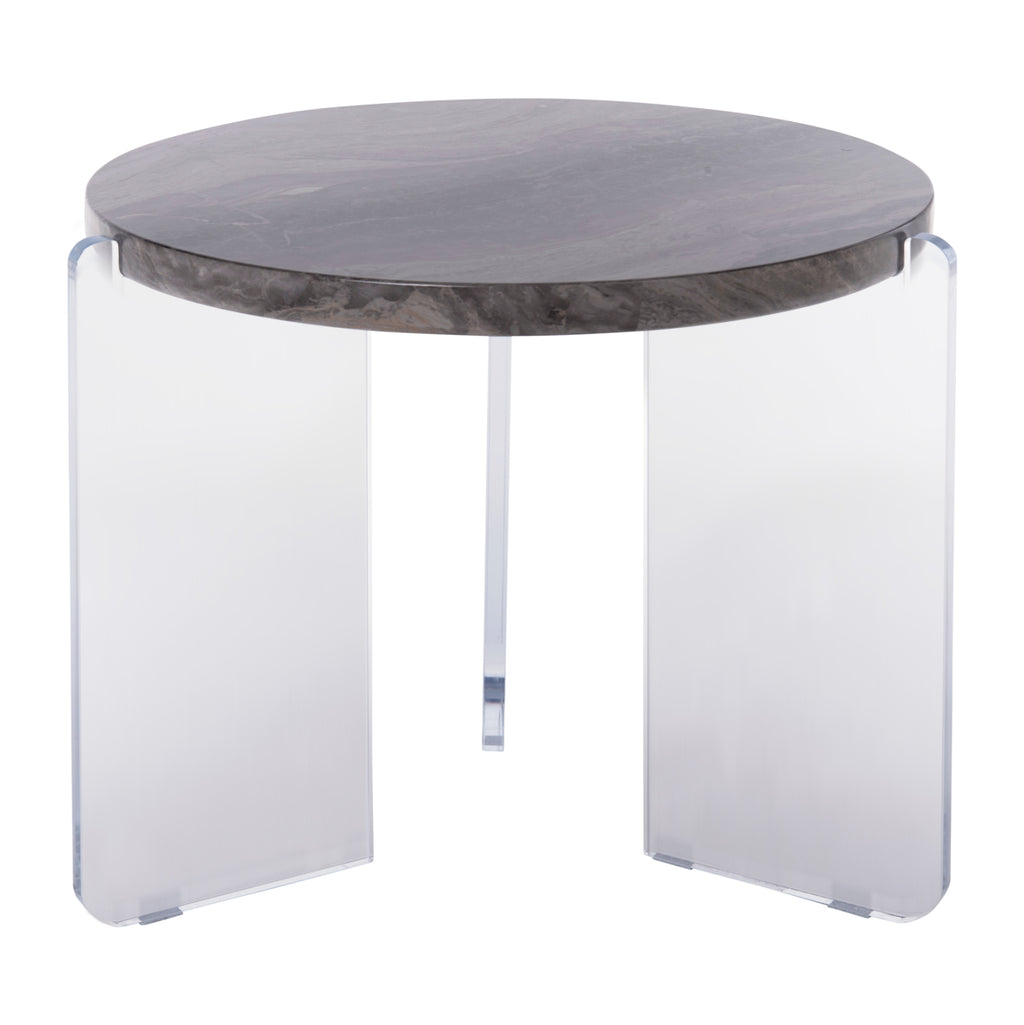 ACRYCON е кръгла холна маса за всекидневна в сивкав цвят STONE TEXTURE. Това оцветяване е направено с двойно покритие "подобно на боя", докато повърхността е водоотблъскваща, което подчертава уникалността на тази маса. Накрая, тази красива леко скосена повърхност се поддържа (завинтва) върху 3 прозрачни АКРИЛНИ крака, които стърчат от периметъра. Тази маса ще обнови естетически вашата всекидневна, докато съчетава много различни стилове и цветове в околното пространство.