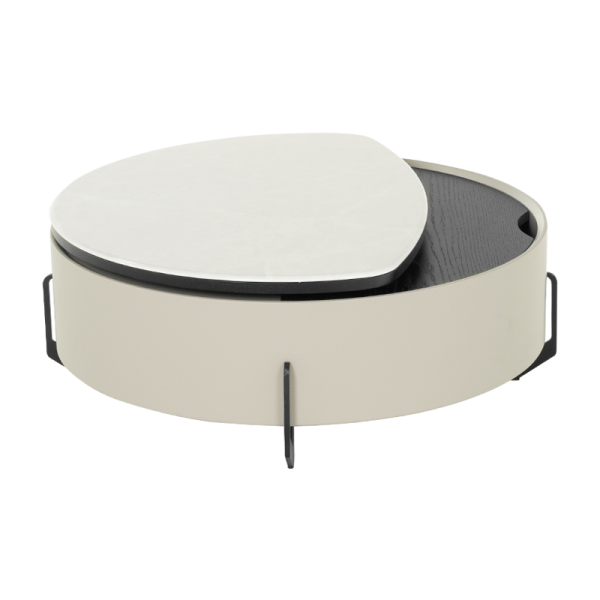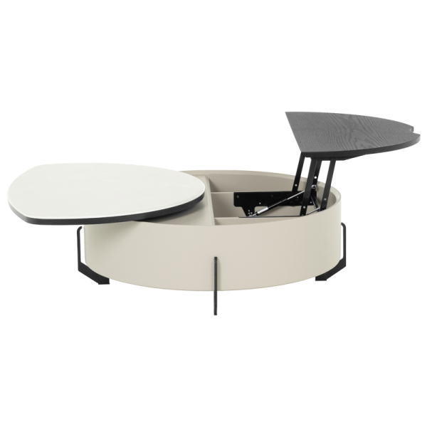 Нестандартен и функционален дизайн Един от най-забележителните елементи на масата е повдигащият механизъм. DOUGLAS се състои от иновативен плот на няколко нива. Първото се върти ефектно, позволявайки на модела да приеме различни, нестандартни форми. То открива пространство за второто, което се повдига с леко придърпване и трансформира елегантната холна масичка в трапезна площ или дори работно пространство. А под него се намират ефектните отделения за съхранение.