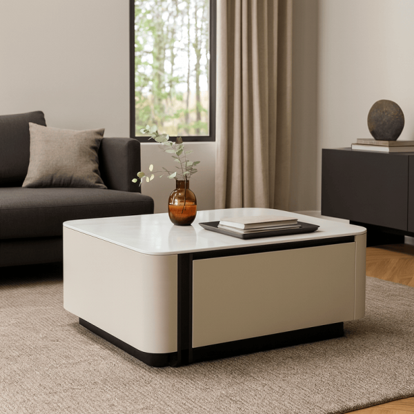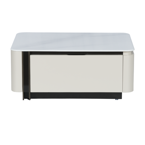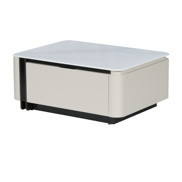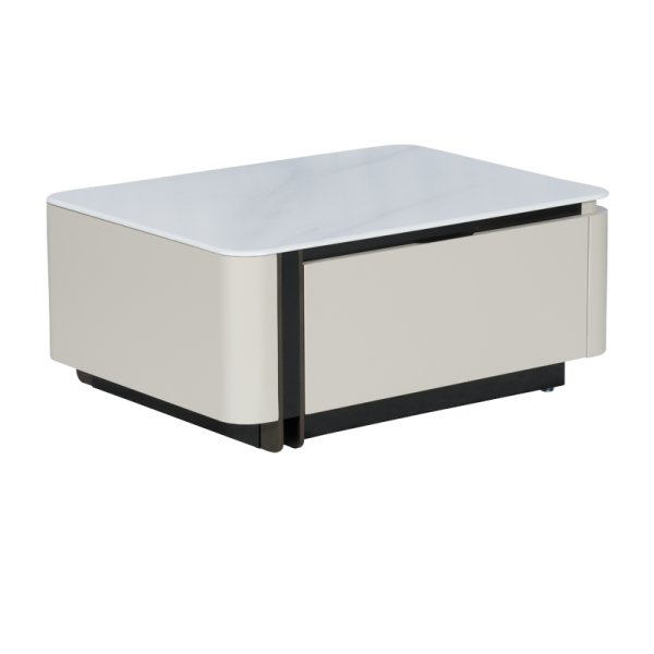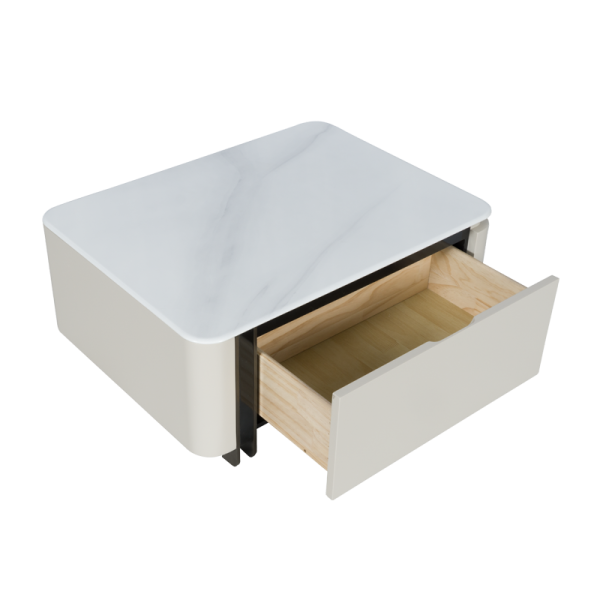 Елегантна и модерна, холна маса ELGIN носи усещане за изтънченост във всяко пространство. Белият ѝ мраморен плот с дебелина 8 мм създава луксозен акцент, а закръглените форми придават меко и балансирано излъчване. Основата от висококачествен МДФ в капучино нюанс се допълва от фино вградено чекмедже с корпус от борова дървесина – перфектно за дискретно съхранение на аксесоари и дребни вещи.