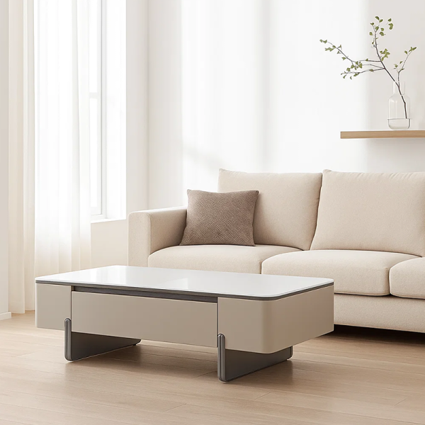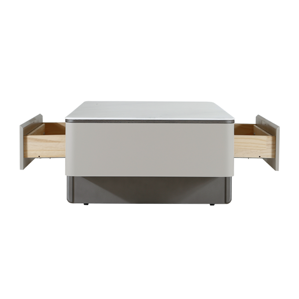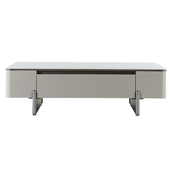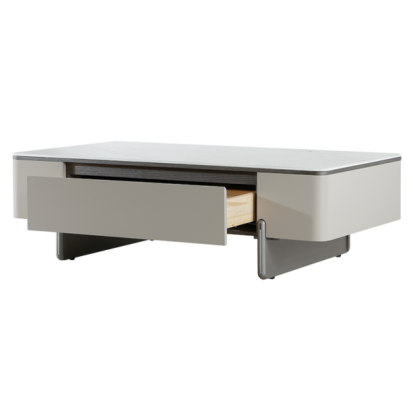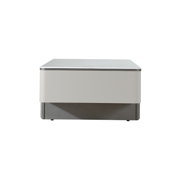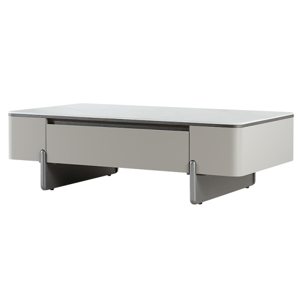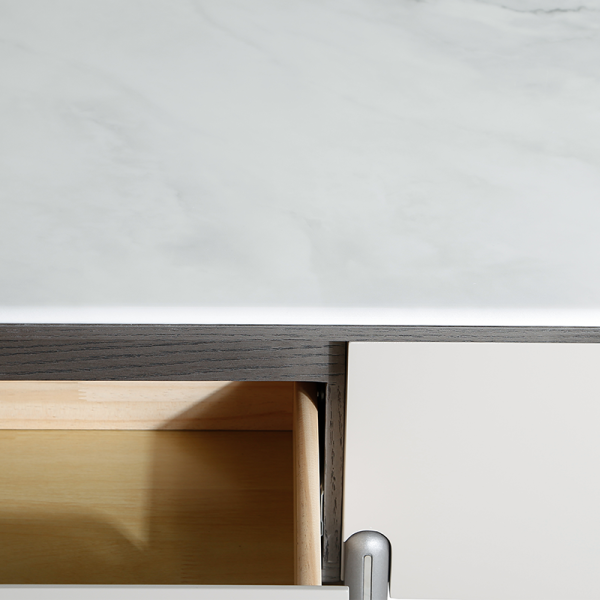 Холна маса FLINT впечатлява с изчистен дизайн и стилна комбинация от бял керамичен плот и основа в цвят капучино. Плотът е с дебелина 8 мм и съчетава мраморен ефект с практична устойчивост. Масата разполага с две чекмеджета с корпуси от борова дървесина – удобни за съхранение на малки вещи и дистанционни. Подходяща е както за модерни, така и за по-класически интериори.