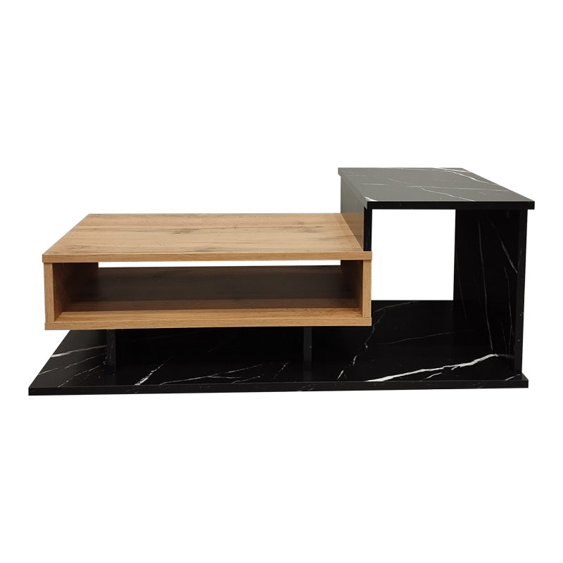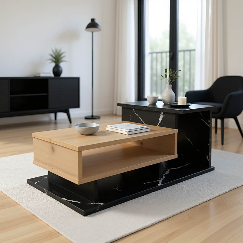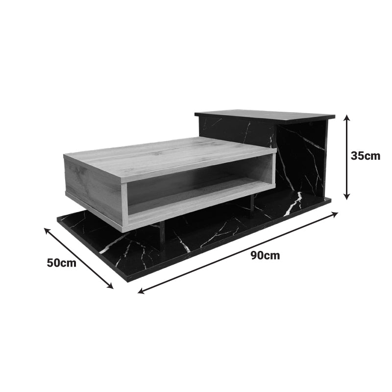 Холна маса Nuvele е отличен избор за тези, които търсят мебел, която съчетава практичност с висока естетика. Той е идеален за създаване на гостоприемна и модерна атмосфера във вашата всекидневна, добавяйки съвременен и изискан щрих към вашето пространство. Технически характеристики: Изработен от 15 мм ПДЧ с меламиново покритие, предлагащ висока издръжливост във времето. Разполага с две повърхности, осигуряващи достатъчно пространство за поставяне на предмети като книги, списания, декоративни елементи. Асиметричното разположение на нивата създава динамичен и визуално интересен ефект. Предлага се в цвят сонома-черен мрамор. Размери на продукта: Дължина: 90 см Ширина: 50 см Височина: 35 см Информация за материала: ПДЧ: ПДЧ е композитен дървесен материал, направен от малки дървесни частици, обикновено бор или ела, свързани заедно под високо налягане и температура с помощта на смоли. Той се използва широко в производството на мебели, вътрешни повърхности и структурни приложения. Изработен от рециклирани материали, той е устойчив на изкривяване, протриване и други физически натоварвания. Инструкции за поддръжка: За почистване на ПДЧ повърхности използвайте мека кърпа, леко навлажнена с вода и мек почистващ препарат. Избягвайте прекомерната употреба на вода и поддържайте повърхността суха след почистване. Забележки: Продуктът се доставя несглобен, в оригиналната си опаковка, с подробно ръководство за монтаж. Действителният цветови нюанс на продукта може леко да се различава от неговото фотографско представяне на вашия екран.