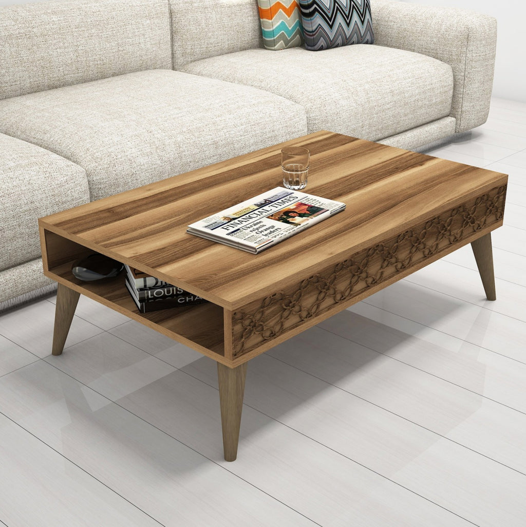 ΜΜ9499.01 холна маса----- Тази холна маса е красива мебел в цвят орех. Неговият практичен дизайн ще промени образа на вашия хол или всекидневна към по-добро. Това е конструкция с прилична горна повърхност. Отдолу има отворено пространство за съхранение като втора повърхност. Характерното обаче в тази холна маса е, че отстрани има резбован дизайн с механични средства (CNC релеф). Елегантност, качество и минимален практичен дизайн характеризират тази холна маса, която е направена за вас. РАЗМЕРИ: 105x60x36.6H см. МАТЕРИАЛИ ЗА ИЗРАБОТКА: Холната маса е изработена от висококачествен меламин с дебелина 18 мм. Меламинът е вид дървесина под формата на ПДЧ (панел). Като материал е много издръжлив и с голяма твърдост, в резултат на което е много устойчив на драскотини, протриване и петна. Страните са издълбани с CNC релефен метод с дебелина 4 мм. Краката са изработени от полиетилен за здравина и леко тегло. ПОДДРЪЖКА: Меламинът, който е строителният материал, се почиства много лесно от петна благодарение на твърдата си повърхност. Можете да забършете всички повърхности с влажна кърпа и това е достатъчно, за да изглежда холната ви маса отново като нова. За упорити петна можете да използвате мек почистващ препарат. Продуктът се доставя в несглобен вид с подробна инструкция за сглобяване