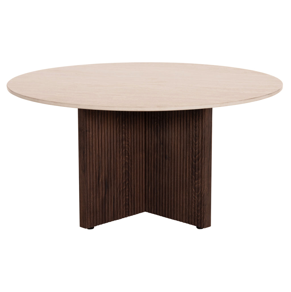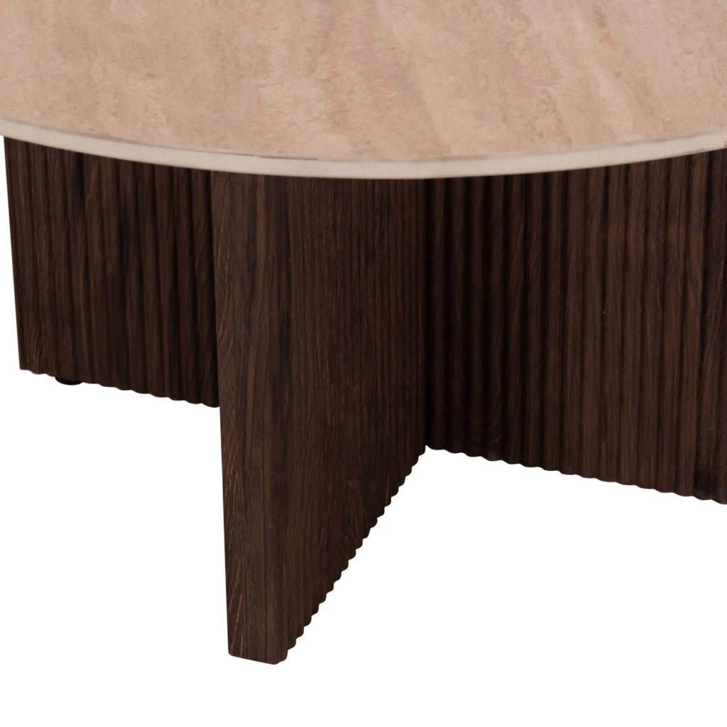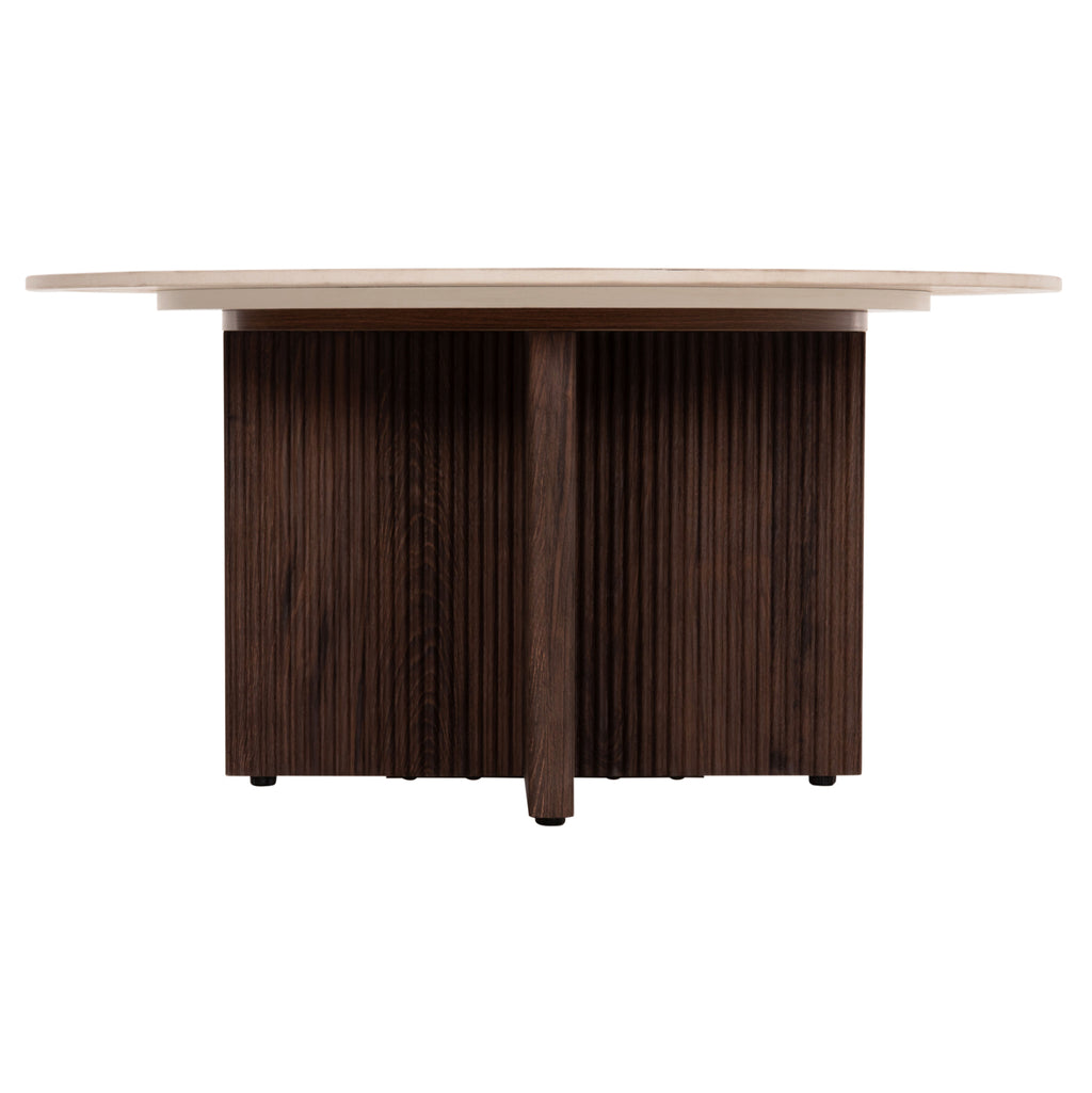 Основата на масата е изработена от MDF (Medium Density Fiberboard) в кафяв цвят с кръстовидна форма и елегантни декоративни гънки. MDF е модерен и широко използван материал в интериорния дизайн, известен със своята здравина, стабилност и хомогенност. Той абсорбира минимално количество влага, което гарантира дълготрайна устойчивост и стабилност на конструкцията.