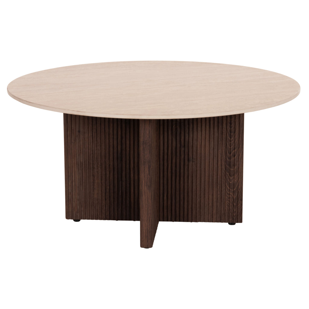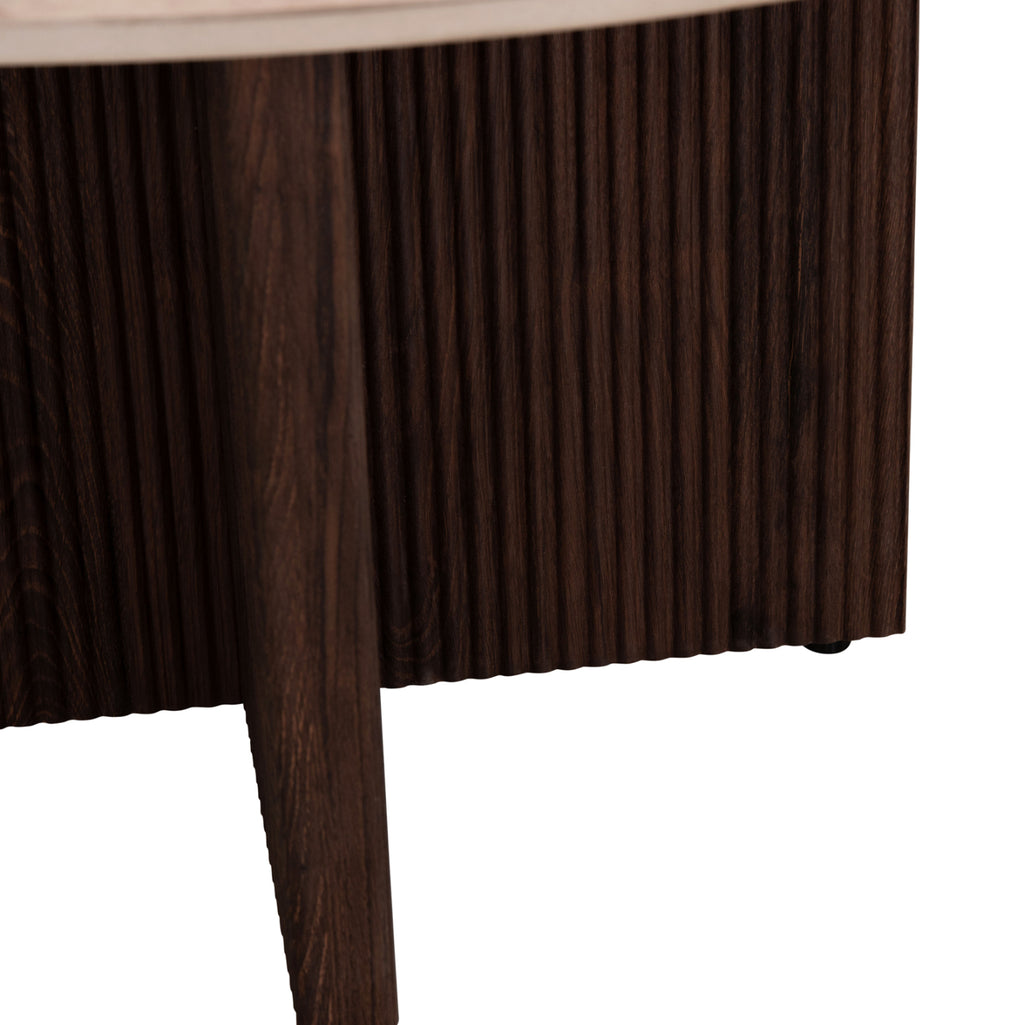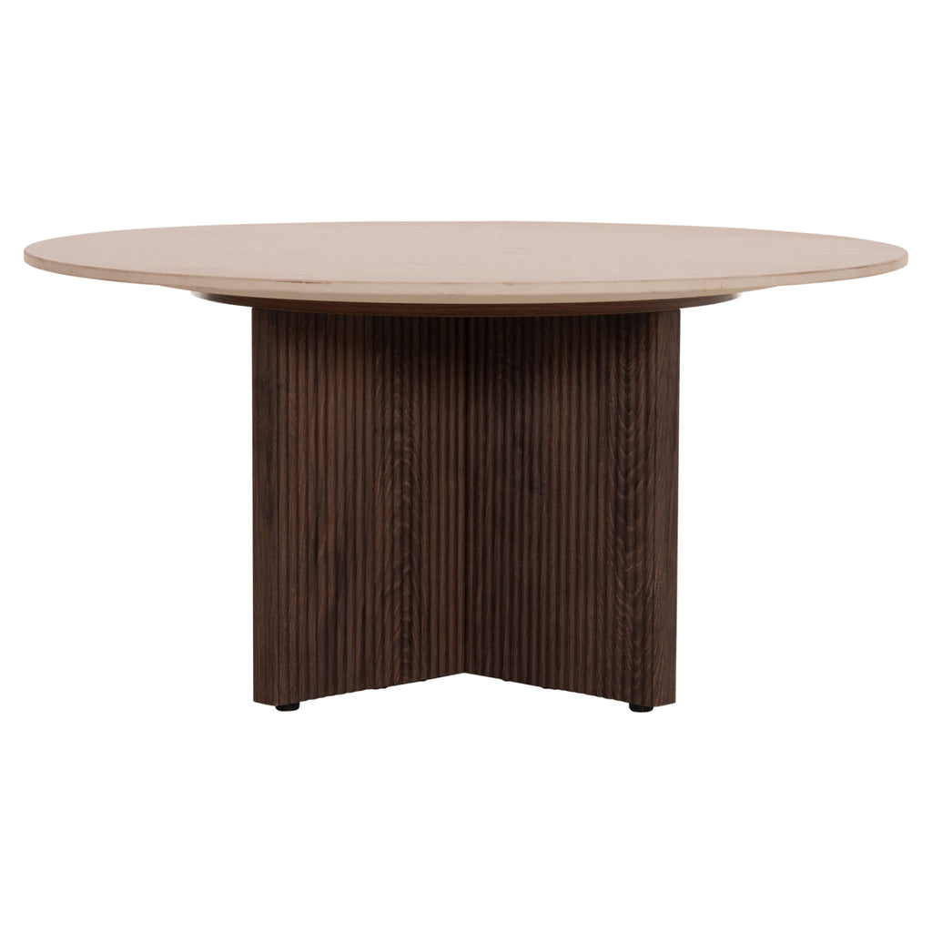 Основата на масата е изработена от MDF (Medium Density Fiberboard) в кафяв цвят с кръстовидна форма и елегантни декоративни гънки. MDF е модерен и широко използван материал в интериорния дизайн, известен със своята здравина, стабилност и хомогенност. Той абсорбира минимално количество влага, което гарантира дълготрайна устойчивост и стабилност на конструкцията.