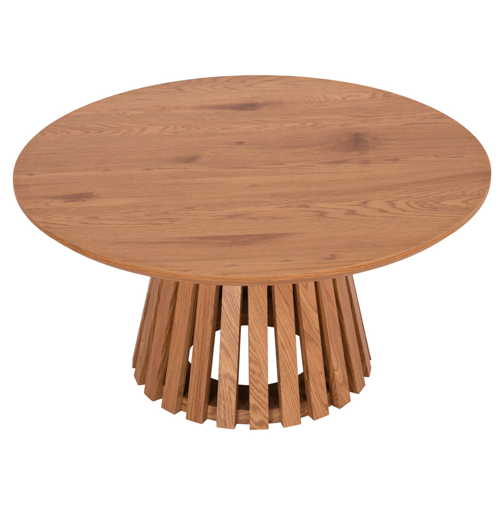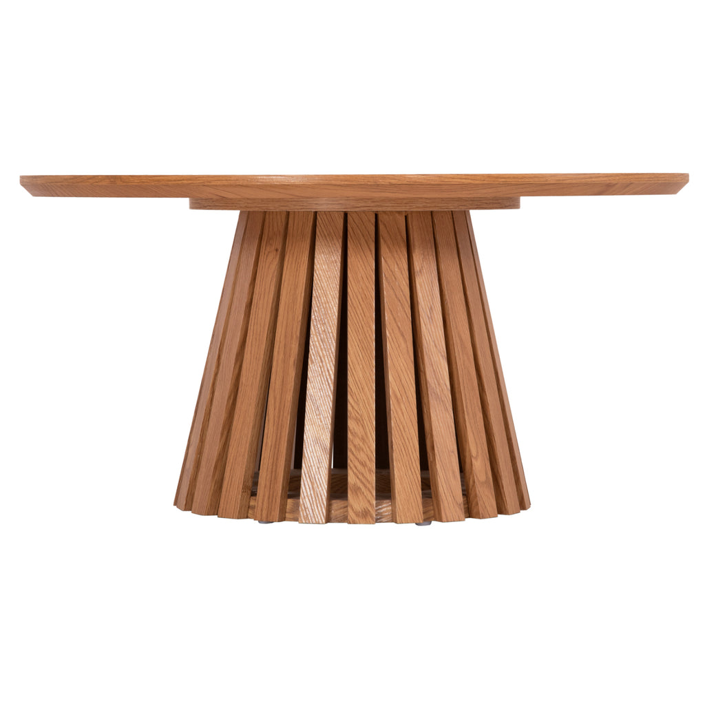 Холна маса TALBERT е кръгла и сравнително ниска маса в дървесен цвят LIGHT NATURAL. Цялата маса е изработена от MDF и се откроява благодарение на красивата си конична основа.