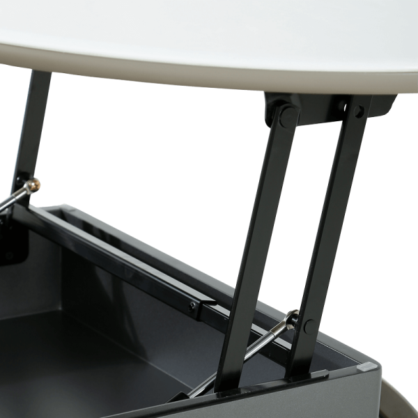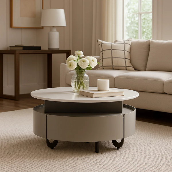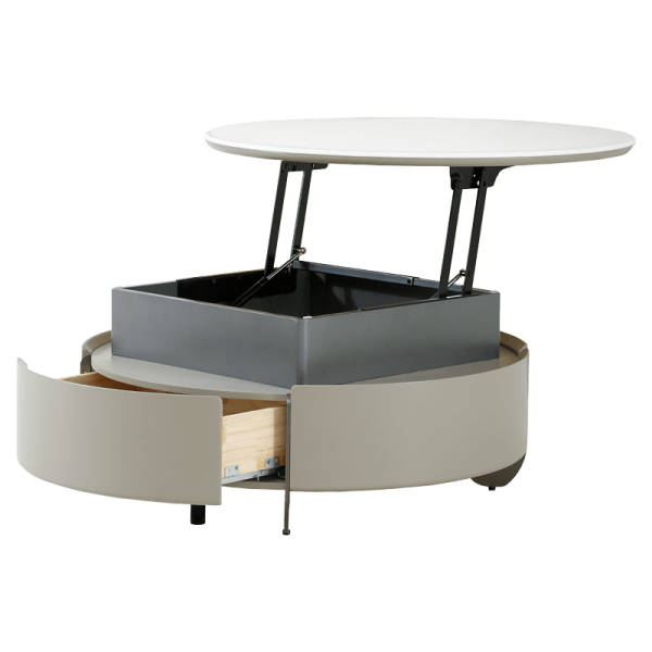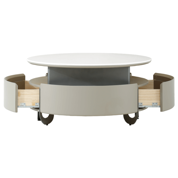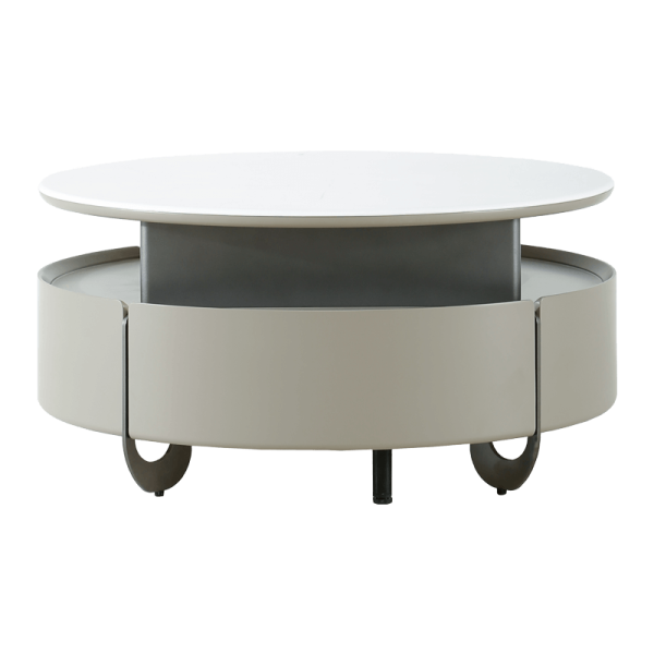 Холната маса TARIA впечатлява с кръгъл керамичен плот, издигащ се елегантно над основа от МДФ в цвят капучино. Освен изтънчения си външен вид, моделът предлага и практичност – плотът се повдига, откривайки скрито вътрешно отделение за съхранение, а двете чекмеджета корпус от борова дървесина плавно се отварят, за да осигурят още повече място за подредба. Стилният дизайн се допълва от извитите детайли и съвременната функционалност, която прави масата подходящ избор за модерна дневна.