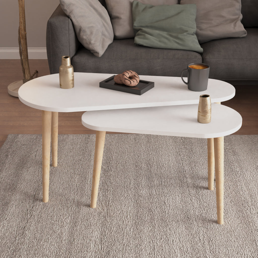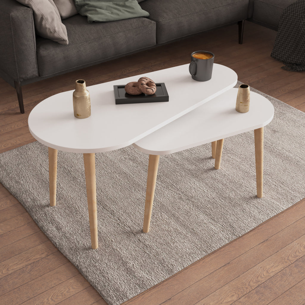 Новият комплект от 2 бр овални маси за хол APRILIA ще задоволи и обслужи всяка ваша нужда в хола. Това са 2 броя трикраки маси с 18мм меламинови повърхности в БЯЛ цвят и двете, а краката са дървени в НАТУРАЛЕН дървесен цвят. РАЗМЕРИ: Голям: 95x47x47H см. ПОДДРЪЖКА: Както повърхностите, така и краката се почистват лесно с влажна кърпа. КАКВО ХАРЕСВАМЕ: •Дизайн •Практичност •Съотношение цена/качество *Продуктът се доставя във фабрична опаковка ** Цветопредаването на продукта може леко да се различава от фотографското представяне на вашия екран.